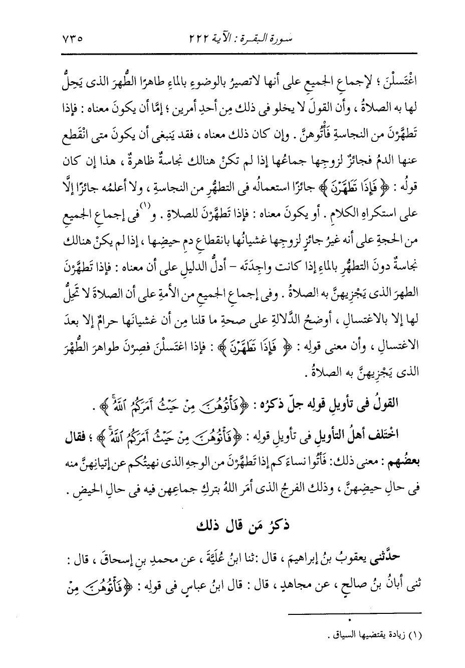 §الْقَوْلُ فِي تَأْوِيلِ قَوْلِهِ تَعَالَى: {فَأْتُوهُنَّ مِنْ حَيْثُ أَمَرَكُمُ اللَّهُ} [البقرة: 222] اخْتَلَفَ أَهْلُ التَّأْوِيلِ فِي تَأْوِيلِ قَوْلِهِ: {فَأْتُوهُنَّ مِنْ حَيْثُ أَمَرَكُمُ اللَّهُ} [البقرة: 222] فَقَالَ بَعْضُهُمْ: مَعْنَى ذَلِكَ: فَأْتُوا نِسَاءَكُمْ إِذَا تَطَهَّرْنَ مِنَ الْوَجْهِ الَّذِي نَهَيْتُكُمْ عَنْ إِتْيَانِهِنَّ مِنْهُ فِي حَالِ حَيْضِهِنَّ، وَذَلِكَ الْفَرْجُ الَّذِي أَمَرَ اللَّهُ بِتَرْكِ جِمَاعِهِنَّ فِيهِ فِي حَالِ الْحَيْضِ