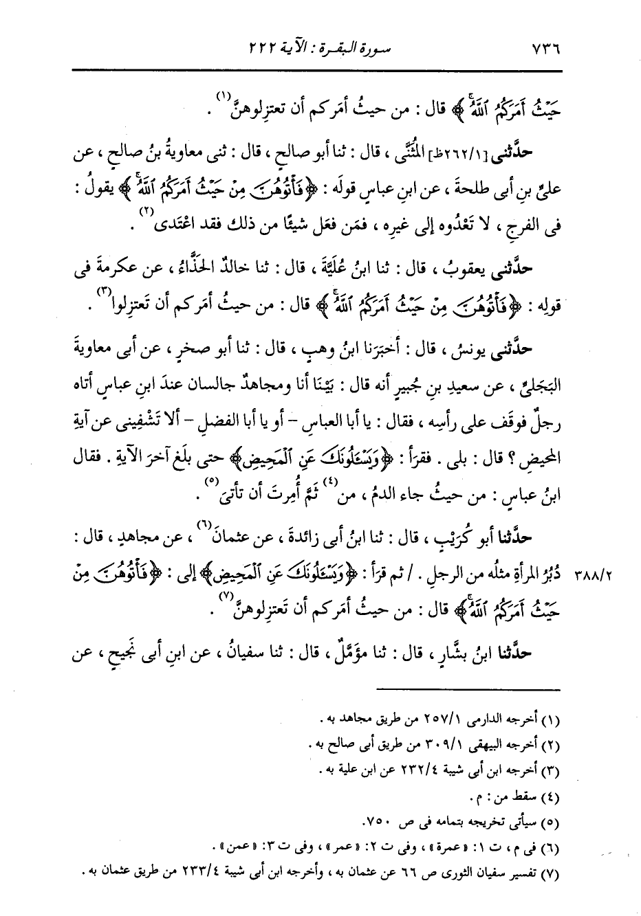 حَدَّثَنِي الْمُثَنَّى، قَالَ: ثنا أَبُو صَالِحٍ، قَالَ: ثنا مُعَاوِيَةُ بْنُ صَالِحٍ، عَنْ عَلِيِّ بْنِ أَبِي طَلْحَةَ، عَنِ ابْنِ عَبَّاسٍ، قَوْلَهُ: " {§فَأْتُوهُنَّ مِنْ حَيْثُ أَمَرَكُمُ اللَّهُ} [البقرة: 222] يَقُولُ: فِي الْفَرْجِ لَا تَعْدُوهُ إِلَى غَيْرِهِ، فَمَنْ فَعَلَ شَيْئًا مِنْ ذَلِكَ فَقَدِ اعْتَدَى "