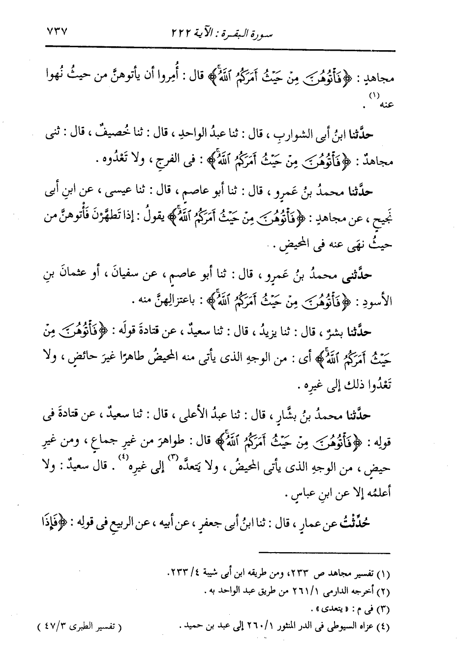 حَدَّثَنَا مُحَمَّدُ بْنُ عَمْرٍو، قَالَ: ثنا أَبُو عَاصِمٍ، قَالَ: ثنا عِيسَى، عَنِ ابْنِ أَبِي نَجِيحٍ، عَنْ مُجَاهِدٍ: " {§فَأْتُوهُنَّ مِنْ حَيْثُ أَمَرَكُمُ اللَّهُ} [البقرة: 222] يَقُولُ: إِذَا تَطَهَّرْنَ فَأْتُوهُنَّ مِنْ حَيْثُ نُهِيَ عَنْهُ فِي الْمَحِيضِ "