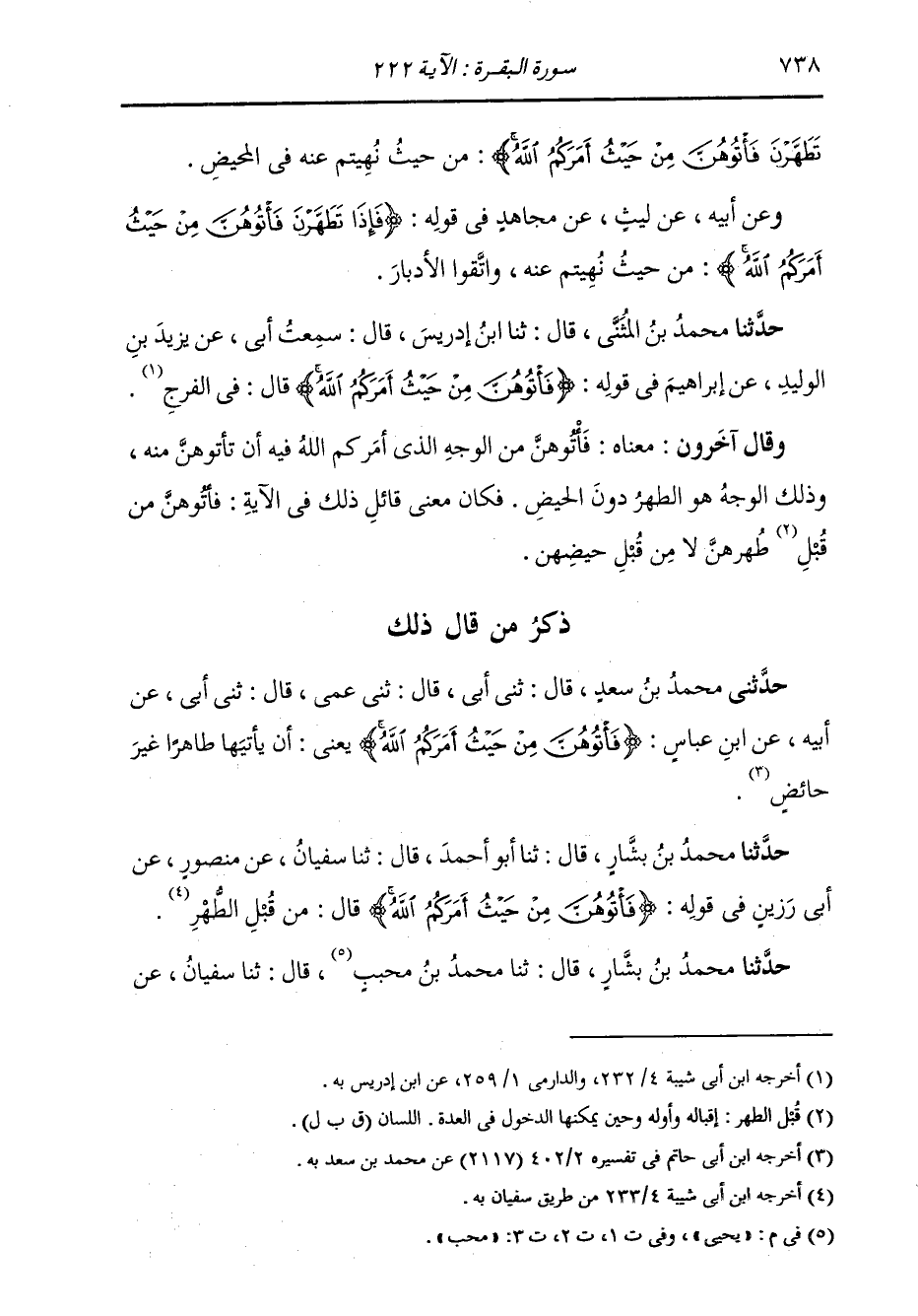 حَدَّثَنَا مُحَمَّدُ بْنُ بَشَّارٍ، قَالَ: ثنا أَبُو أَحْمَدَ، قَالَ: ثنا سُفْيَانُ، عَنْ مَنْصُورٍ، عَنْ أَبِي رَزِينٍ، فِي قَوْلِهِ: " {§فَأْتُوهُنَّ مِنْ حَيْثُ أَمَرَكُمُ اللَّهُ} [البقرة: 222] قَالَ: مِنْ قِبَلِ الطُّهْرِ " حَدَّثَنَا مُحَمَّدُ بْنُ بَشَّارٍ، قَالَ: ثنا مُحَمَّدُ بْنُ يَحْيَى، قَالَ: ثنا سُفْيَانُ، عَنِ -[739]- الْأَعْمَشِ، عَنْ أَبِي رَزِينٍ، بِمِثْلِهِ