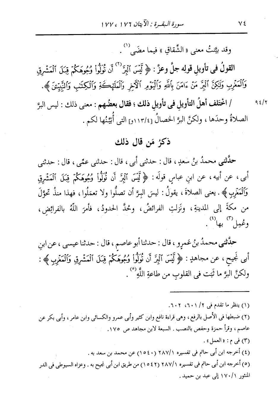 حَدَّثَنِي مُحَمَّدُ بْنُ عَمْرٍو، قَالَ: ثنا أَبُو عَاصِمٍ، قَالَ: ثنا عِيسَى، عَنِ ابْنِ أَبِي نَجِيحٍ، عَنْ مُجَاهِدٍ، " {§لَيْسَ الْبِرُّ} [البقرة: 177] أَنْ تُوَلُّوا، وُجُوهَكُمْ قِبَلَ الْمَشْرِقِ وَالْمَغْرِبِ وَلَكِنَّ الْبِرَّ مَا ثَبَتَ فِي الْقُلُوبِ مِنْ طَاعَةِ اللَّهِ " -[75]- حَدَّثَنِي الْقَاسِمُ، قَالَ: ثنا أَبُو حُذَيْفَةَ، قَالَ: ثنا شِبْلٌ، عَنِ ابْنِ أَبِي نَجِيحٍ، عَنْ مُجَاهِدٍ، مِثْلَهُ