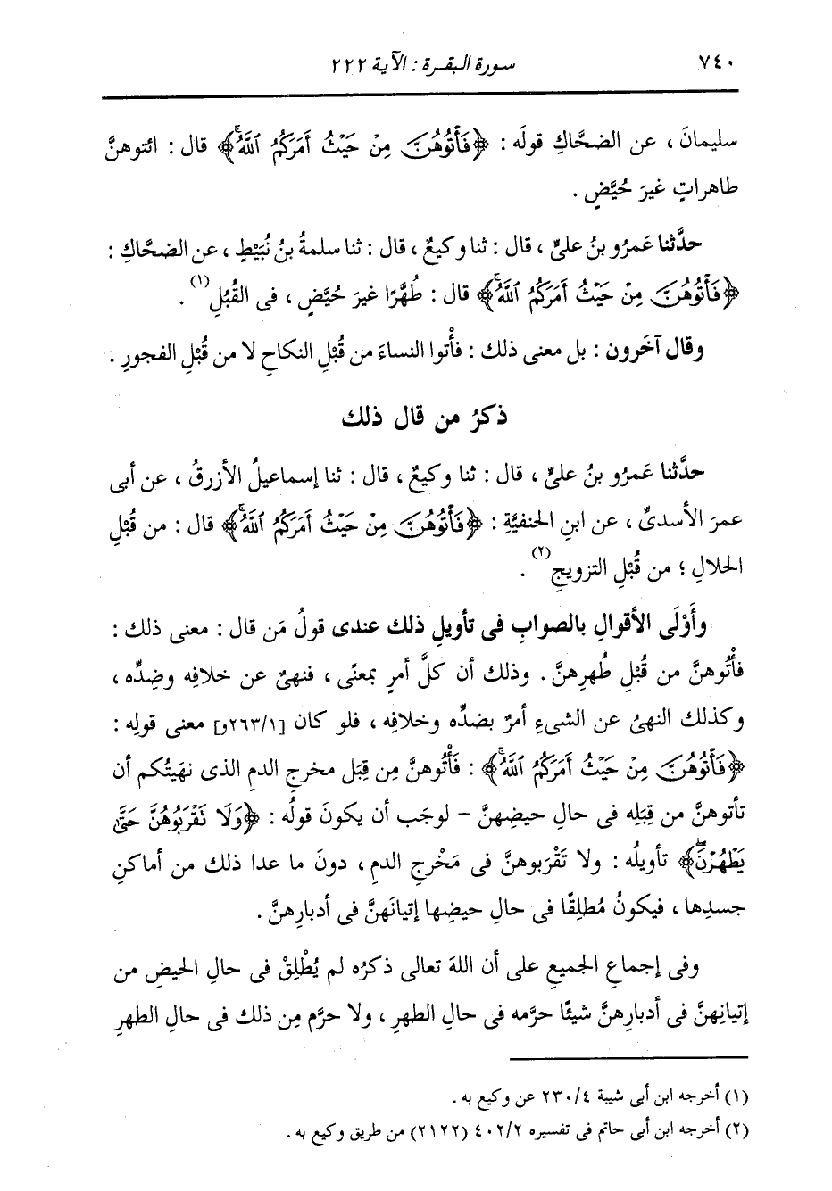 حَدَّثَنَا عَمْرُو بْنُ عَلِيٍّ، قَالَ: ثنا وَكِيعٌ، قَالَ: ثنا سَلَمَةُ بْنُ نُبَيْطٍ، عَنِ الضَّحَّاكِ: " {§فَأْتُوهُنَّ مِنْ حَيْثُ أَمَرَكُمُ اللَّهُ} [البقرة: 222] قَالَ: طُهُرًا غَيْرَ حِيَضٍ فِي الْقُبُلِ " وَقَالَ آخَرُونَ: بَلَى مَعْنَى ذَلِكَ: فَأْتُوا النِّسَاءَ مِنْ قِبَلِ النِّكَاحِ لَا مِنْ قِبَلِ الْفُجُورِ