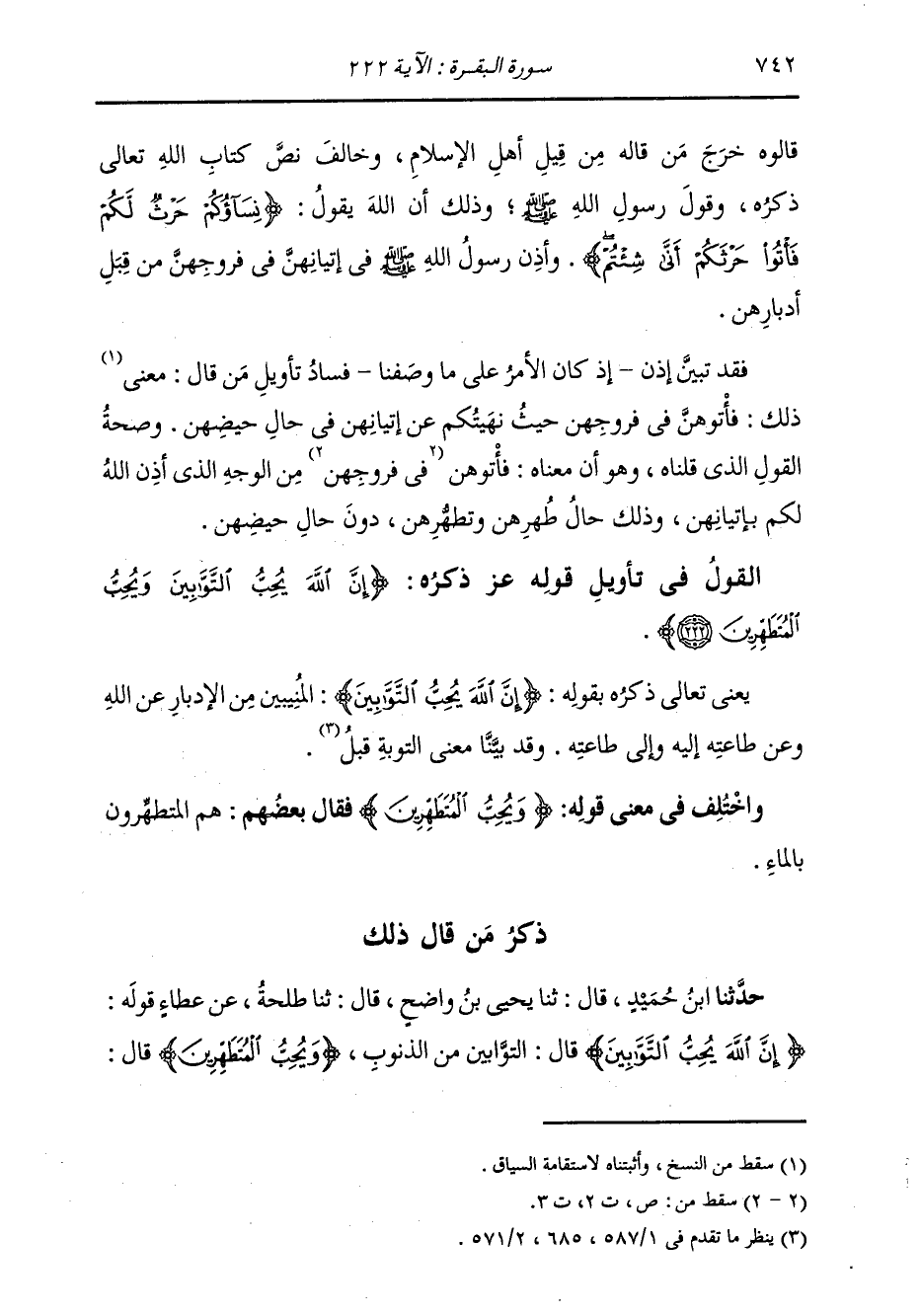 ذِكْرُ مَنْ قَالَ ذَلِكَ حَدَّثَنَا ابْنُ حُمَيْدٍ، قَالَ: ثنا يَحْيَى بْنُ وَاضِحٍ، قَالَ: ثنا طَلْحَةُ، عَنْ عَطَاءٍ، قَوْلَهُ: " {§إِنَّ اللَّهَ يُحِبُّ التَّوَّابِينَ} [البقرة: 222] قَالَ: التَّوَّابِينَ مِنَ الذُّنُوبِ، {وَيُحِبُّ الْمُتَطَهِّرِينَ} [البقرة: 222] قَالَ: -[743]- الْمُتَطَهِّرِينَ بِالْمَاءِ لِلصَّلَاةِ " حَدَّثَنِي أَحْمَدُ بْنُ حَازِمٍ، قَالَ: ثنا أَبُو نُعَيْمٍ، قَالَ: ثنا طَلْحَةُ، عَنْ عَطَاءٍ، مِثْلَهُ