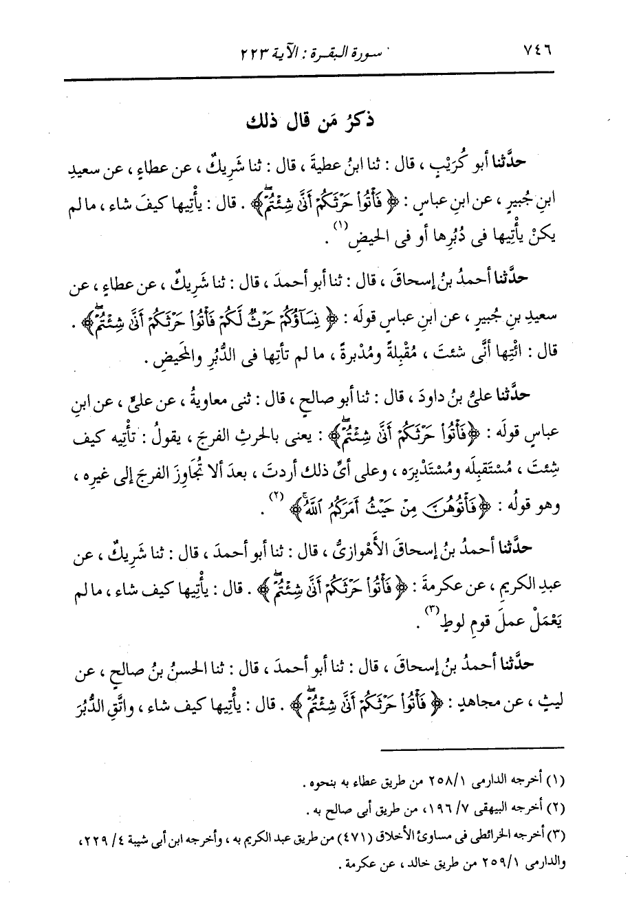 حَدَّثَنَا عَلِيُّ بْنُ دَاوُدَ، قَالَ: ثنا أَبُو صَالِحٍ، قَالَ: ثني مُعَاوِيَةُ، عَنْ عَلِيٍّ، عَنِ ابْنِ عَبَّاسٍ، قَوْلَهُ: " {§فَأْتُوا حَرْثَكُمْ أَنَّى شِئْتُمْ} [البقرة: 223] يَعْنِي بِالْحَرْثِ: الْفَرْجَ، يَقُولُ: تَأْتِيَهِ كَيْفَ شِئْتَ مُسْتَقْبَلَةً، وَمُسْتَدْبَرَةً وَعَلَى أَيِّ ذَلِكَ أَرَدْتَ بَعْدَ أَنْ لَا تُجَاوِزَ الْفَرْجَ إِلَى غَيْرِهِ، وَهُوَ قَوْلُهُ: {فَأْتُوهُنَّ مِنْ حَيْثُ أَمَرَكُمُ اللَّهُ} [البقرة: 222] "