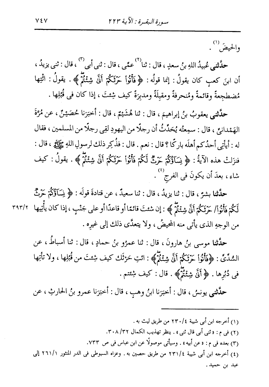 حَدَّثَنَا مُوسَى بْنُ هَارُونَ، قَالَ: ثنا عَمْرُو بْنُ حَمَّادٍ، قَالَ: ثنا أَسْبَاطٌ، عَنِ السُّدِّيِّ: " {§فَأْتُوا حَرْثَكُمْ أَنَّى شِئْتُمْ} [البقرة: 223] ائْتِ حَرْثَكَ كَيْفَ شِئْتَ مِنْ قُبُلِهَا، وَلَا تَأْتِيهَا فِي دُبُرِهَا {أَنَّى شِئْتُمْ} [البقرة: 223] قَالَ: كَيْفَ شِئْتُمْ "