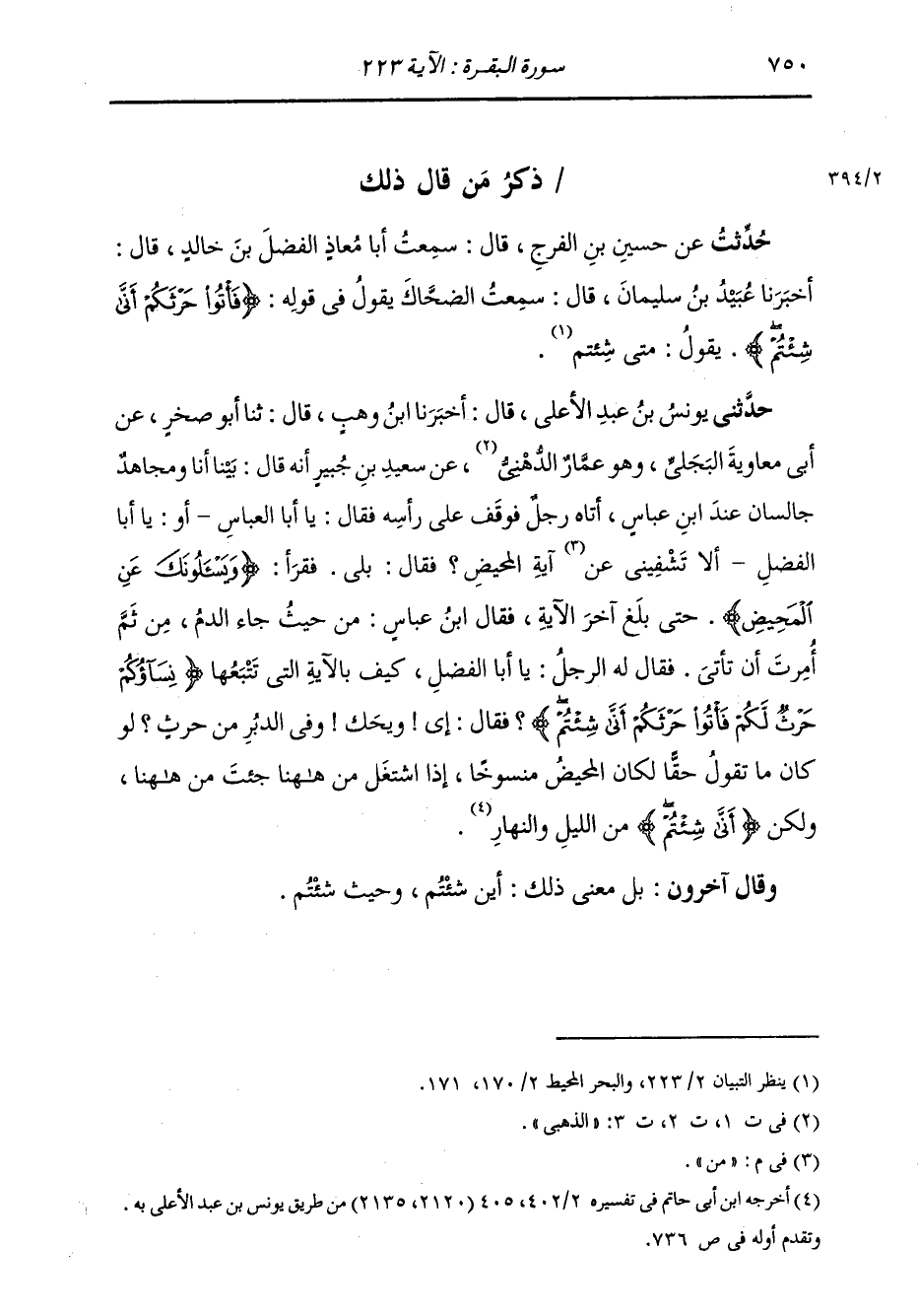 حَدَّثَنِي يُونُسُ بْنُ عَبْدِ الْأَعْلَى، قَالَ: أَخْبَرَنَا ابْنُ وَهْبٍ، قَالَ: ثنا أَبُو صَخْرٍ، عَنْ أَبِي مُعَاوِيَةَ الْبَجَلِيِّ وَهُوَ عَمَّارٌ الدُّهْنِيُّ، عَنْ سَعِيدِ بْنِ جُبَيْرٍ، أَنَّهُ قَالَ: بَيْنَا أَنَا وَمُجَاهِدُ، جَالِسَانِ عِنْدَ ابْنِ عَبَّاسٍ، أَتَاهُ رَجُلٌ فَوَقَفَ عَلَى رَأْسِهِ، فَقَالَ: يَا أَبَا الْعَبَّاسِ، أَوْ يَا أَبَا الْفَضْلِ أَلَا تَشْفِينِي عَنْ آيَةِ الْمَحِيضِ؟ فَقَالَ: بَلَى فَقَرَأَ: " {§وَيَسْأَلُونَكَ عَنِ الْمَحِيضِ} [البقرة: 222] حَتَّى بَلَغَ آخِرَ الْآيَةِ، فَقَالَ ابْنُ عَبَّاسٍ: مِنْ حَيْثُ جَاءَ الدَّمُ مِنْ ثَمَّ أُمِرْتَ أَنْ تَأْتِيَ، فَقَالَ لَهُ الرَّجُلُ: يَا أَبَا الْفَضْلِ كَيْفَ بِالْآيَةِ الَّتِي تَتْبَعُهَا {نِسَاؤُكُمْ حَرْثٌ لَكُمْ فَأْتُوا حَرْثَكُمْ أَنَّى شِئْتُمْ} [البقرة: 223] فَقَالَ: إِي وَيْحَكَ، وَفِي الدُّبُرِ مِنْ حَرْثٍ؟ لَوْ كَانَ مَا تَقُولُ حَقًّا لَكَانَ الْمَحِيضُ مَنْسُوخًا إِذَا اشْتَغَلَ مِنْ هَاهُنَا جِئْتَ مِنْ هَاهُنَا وَلَكِنْ أَنَّى شِئْتُمْ مِنَ اللَّيْلِ، وَالنَّهَارِ " وَقَالَ آخَرُونَ: بَلْ مَعْنَى ذَلِكَ: أَيْنَ شِئْتُمْ، وَحَيْثُ شِئْتُمْ