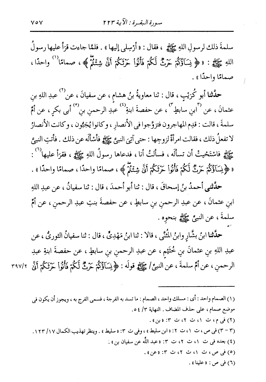 حَدَّثَنَا أَبُو كُرَيْبٍ، قَالَ: ثنا مُعَاوِيَةُ بْنُ هِشَامٍ، عَنْ سُفْيَانَ، عَنْ عَبْدِ اللَّهِ بْنِ عُثْمَانَ، عَنِ ابْنِ سَابِطٍ، عَنْ حَفْصَةَ ابْنَةِ عَبْدِ الرَّحْمَنِ بْنِ أَبِي بَكْرٍ، عَنْ أُمِّ سَلَمَةَ، قَالَتْ: " قَدِمَ الْمُهَاجِرُونَ فَتَزَوَّجُوا فِي الْأَنْصَارِ، وَكَانُوا يَجُبُّونَ، وَكَانَتِ الْأَنْصَارُ لَا تَفْعَلُ ذَلِكَ، فَقَالَتِ امْرَأَةٌ لِزَوْجِهَا: حَتَّى آتِي النَّبِيَّ صَلَّى اللهُ عَلَيْهِ وَسَلَّمَ فَأَسْأَلَهُ عَنْ ذَلِكَ. فَأَتَتِ النَّبِيَّ صَلَّى اللهُ عَلَيْهِ وَسَلَّمَ، فَاسْتَحْيَتْ أَنْ تَسْأَلَهُ، فَسَأَلْتُ أَنَا. فَدَعَاهَا رَسُولُ اللَّهِ صَلَّى اللهُ عَلَيْهِ وَسَلَّمَ، فَقَرَأَ عَلَيْهَا: {§نِسَاؤُكُمْ حَرْثٌ لَكُمْ فَأْتُوا حَرْثَكُمْ أَنَّى شِئْتُمْ} [البقرة: 223] «صِمَامًا وَاحِدًا، صِمَامًا وَاحِدًا» حَدَّثَنِي أَحْمَدُ بْنُ إِسْحَاقَ، قَالَ: ثنا أَبُو أَحْمَدَ، قَالَ: ثنا سُفْيَانُ، عَنْ عَبْدِ اللَّهِ بْنِ عُثْمَانَ، عَنْ عَبْدِ الرَّحْمَنِ بْنِ سَابِطٍ، عَنْ حَفْصَةَ بِنْتِ عَبْدِ الرَّحْمَنِ، عَنْ أُمِّ سَلَمَةَ، عَنِ النَّبِيِّ صَلَّى اللهُ عَلَيْهِ وَسَلَّمَ بِنَحْوِهِ