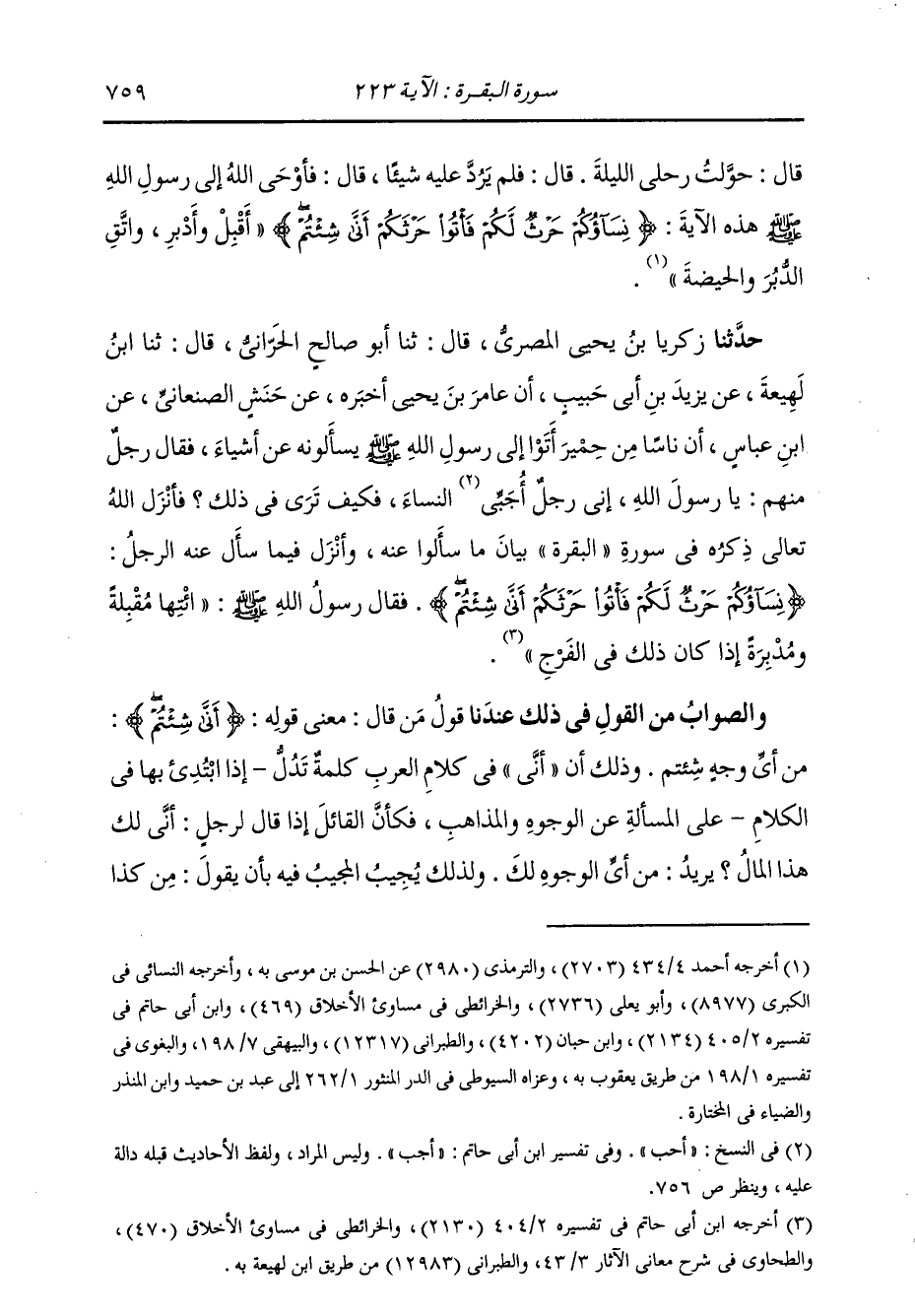 حَدَّثَنَا زَكَرِيَّا بْنُ يَحْيَى الْمِصْرِيُّ، قَالَ: ثنا أَبُو صَالِحٍ الْحَرَّانِيُّ، قَالَ: ثنا ابْنُ لَهِيعَةَ، عَنْ يَزِيدَ بْنِ أَبِي حَبِيبٍ، أَنَّ عَامِرَ بْنَ يَحْيَى، أَخْبَرَهُ عَنْ حَنَشٍ الصَّنْعَانِيِّ، عَنِ ابْنِ عَبَّاسٍ: " أَنَّ نَاسًا، مِنْ حِمْيَرٍ أَتَوْا إِلَى رَسُولِ اللَّهِ صَلَّى اللهُ عَلَيْهِ وَسَلَّمَ يَسْأَلُونَهُ عَنْ أَشْيَاءَ، فَقَالَ رَجُلٌ مِنْهُمْ: يَا رَسُولَ اللَّهِ إِنِّي رَجُلٌ أُحِبُّ النِّسَاءَ، فَكَيْفَ تَرَى فِي ذَلِكَ؟ فَأَنْزَلَ اللَّهُ تَعَالَى ذِكْرُهُ فِي سُورَةِ الْبَقَرَةِ بَيَانَ مَا سَأَلُوا عَنْهُ، وَأَنْزَلَ فِيمَا سَأَلَ عَنْهُ الرَّجُلُ: {§نِسَاؤُكُمْ حَرْثٌ لَكُمْ فَأْتُوا حَرْثَكُمْ أَنَّى شِئْتُمْ} [البقرة: 223] فَقَالَ رَسُولُ اللَّهِ صَلَّى اللهُ عَلَيْهِ وَسَلَّمَ: «ائْتِهَا مُقْبِلَةً، وَمُدْبِرَةً إِذَا كَانَ ذَلِكَ فِي الْفَرْجِ» وَالصَّوَابُ مِنَ الْقَوْلِ فِي ذَلِكَ عِنْدَنَا قَوْلُ مَنْ قَالَ: مَعْنَى قَوْلِهِ {أَنَّى شِئْتُمْ} [البقرة: 223] مِنْ أَيِّ وَجْهٍ شِئْتُمْ، وَذَلِكَ أَنَّ أَنَّى فِي كَلَامِ الْعَرَبِ كَلِمَةٌ تَدُلُّ إِذَا ابْتُدِئَ بِهَا فِي الْكَلَامِ عَلَى الْمَسْأَلَةِ عَنِ الْوُجُوهِ، وَالْمَذَاهِبِ، فَكَأَنَّ الْقَائِلَ إِذَا قَالَ لِرَجُلٍ: أَنَّى لَكَ هَذَا الْمَالُ؟ يُرِيدُ مِنْ أَيِّ الْوُجُوهِ لَكَ، وَلِذَلِكَ يُجِيبُ الْمُجِيبُ فِيهِ بِأَنْ يَقُولَ: مِنْ كَذَا -[760]- وَكَذَا، كَمَا قَالَ تَعَالَى ذِكْرُهُ مُخْبِرًا عَنْ زَكَرِيَّا فِي مَسْأَلَتِهِ مَرْيَمَ: {أَنَّى لَكِ هَذَا قَالَتْ هُوَ مِنْ عِنْدِ اللَّهِ} [آل عمران: 37] وَهِيَ مُقَارِبَةٌ أَيْنَ وَكَيْفَ فِي الْمَعْنَى، وَلِذَلِكَ تَدَاخَلَتْ مَعَانِيهَا، فَأَشْكَلَتْ «أَنَّى» عَلَى سَامِعِهَا، وَمُتَأَوِّلِهَا حَتَّى تَأَوَّلَهَا بَعْضُهُمْ بِمَعْنَى أَيْنَ، وَبَعْضُهُمْ بِمَعْنَى كَيْفَ، وَآخَرُونَ بِمَعْنَى مَتَى، وَهِيَ مُخَالَفَةٌ جَمِيعَ ذَلِكَ فِي مَعْنَاهَا وَهُنَّ لَهَا مُخَالِفَاتٌ. وَذَلِكَ أَنَّ «أَيْنَ» إِنَّمَا هِيَ حَرْفُ اسْتِفْهَامٍ عَنِ الْأَمَاكِنِ وَالْمَحَالِ، وَإِنَّمَا يُسْتَدَلُّ عَلَى افْتِرَاقِ مَعَانِي هَذِهِ الْحُرُوفِ بِافْتِرَاقِ الْأَجْوِبَةِ عَنْهَا. أَلَا تَرَى أَنَّ سَائِلًا لَوْ سَأَلَ آخَرَ فَقَالَ: أَيْنَ مَالُكَ؟ لَقَالَ بِمَكَانِ كَذَا، وَلَوْ قَالَ لَهُ: أَيْنَ أَخُوكَ؟ لَكَانَ الْجَوَّابُ أَنْ يَقُولَ: بِبَلْدَةِ كَذَا، أَوْ بِمَوْضِعِ كَذَا، فَيُجِيبَهُ بِالْخَبَرِ عَنْ مَحَلِّ مَا سَأَلَهُ عَنْ مَحَلِّهِ، فَيُعْلَمُ أَنَّ أَيْنَ مَسْأَلَةٌ عَنِ الْمَحَلِّ. وَلَوْ قَالَ قَائِلٌ لِآخَرَ: كَيْفَ أَنْتَ؟ لَقَالَ: صَالِحٌ أَوْ بِخَيْرٍ أَوْ فِي عَافِيَةٍ، وَأَخْبَرَهُ عَنْ حَالِهِ الَّتِي هُوَ فِيهَا، فَيُعْلَمُ حِينَئِذٍ أَنَّ كَيْفَ مَسْأَلَةٌ عَنْ حَالِ الْمَسْئُولِ عَنْ حَالِهِ. وَلَوْ قَالَ لَهُ: أَنَّى يُحْيِي اللَّهُ هَذَا الْمَيِّتَ؟ لَكَانَ الْجَوَّابُ أَنْ يُقَالَ: مِنْ وَجْهِ كَذَا وَوَجْهِ كَذَا، فَيَصِفُ قَوْلًا نَظِيرَ مَا وَصَفَ اللَّهُ تَعَالَى ذِكْرُهُ لِلَّذِي قَالَ: {أَنَّى يُحْيِي هَذِهِ اللَّهُ بَعْدَ مَوْتِهَا} [البقرة: 259] فِعْلًا حِينَ بَعَثَهُ مِنْ بَعْدِ مَمَاتِهِ. وَقَدْ فَرَّقَتِ الشُّعَرَاءُ بَيْنَ ذَلِكَ فِي أَشْعَارِهَا، فَقَالَ الْكُمَيْتُ بْنُ زَيْدٍ: