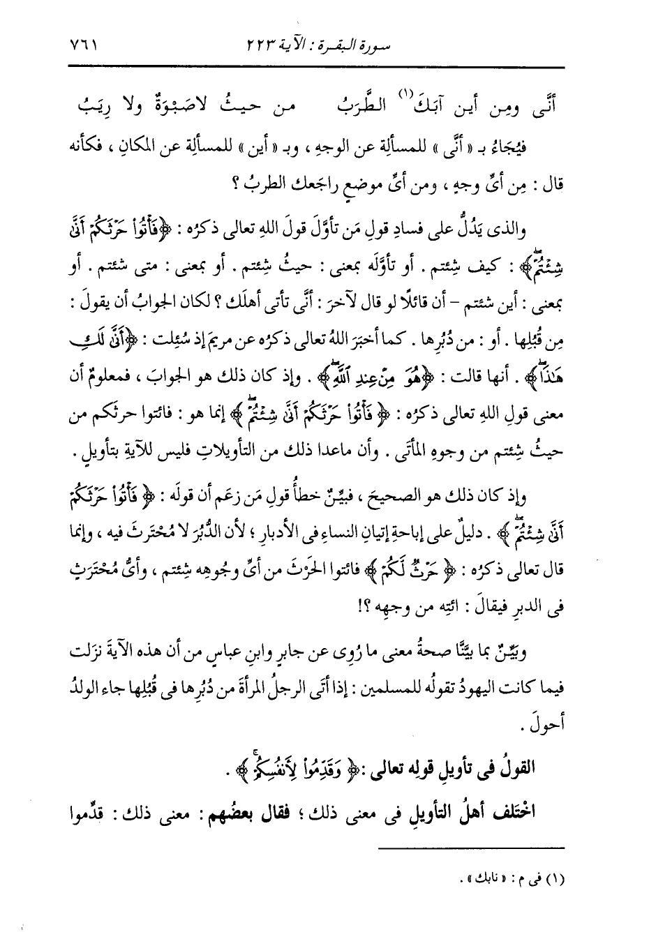 §الْقَوْلُ فِي تَأْوِيلِ قَوْلِهِ تَعَالَى: {وَقَدِّمُوا لِأَنْفُسِكُمْ} [البقرة: 223] اخْتَلَفَ أَهْلُ التَّأْوِيلِ فِي مَعْنَى ذَلِكَ، فَقَالَ بَعْضُهُمْ: مَعْنَى ذَلِكَ: قَدِّمُوا -[762]- لِأَنْفُسِكُمُ الْخَيْرَ