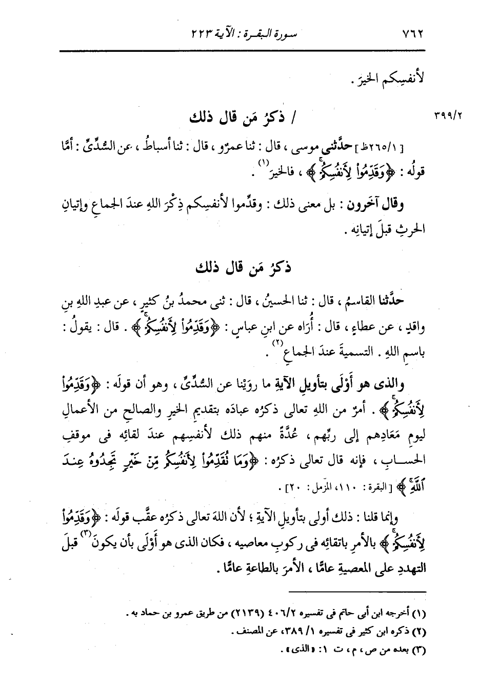 ذِكْرُ مَنْ قَالَ ذَلِكَ حَدَّثَنَا الْقَاسِمُ، قَالَ: ثنا الْحُسَيْنُ، قَالَ: ثني مُحَمَّدُ بْنُ كَثِيرٍ، عَنْ عَبْدِ اللَّهِ بْنِ وَاقِدٍ، عَنْ عَطَاءٍ، قَالَ: أُرَاهُ عَنِ ابْنِ عَبَّاسٍ: " {§وَقَدِّمُوا لِأَنْفُسِكُمْ} [البقرة: 223] قَالَ: التَّسْمِيَةُ عِنْدَ الْجِمَاعِ، يَقُولُ: بِسْمِ اللَّهِ " وَالَّذِي هُوَ أَوْلَى بِتَأْوِيلِ الْآيَةِ، مَا رُوِّينَا عَنِ السُّدِّيِّ، وَهُوَ أَنَّ قَوْلَهُ: {وَقَدِّمُوا لِأَنْفُسِكُمْ} [البقرة: 223] أَمْرٌ مِنَ اللَّهِ تَعَالَى ذِكْرُهُ عِبَادَهُ بِتَقْدِيمِ الْخَيْرِ، وَالصَّالِحِ مِنَ الْأَعْمَالِ لِيَوْمِ مَعَادِهِمْ إِلَى رَبِّهِمْ، عِدَّةً مِنْهُمْ ذَلِكَ لِأَنْفُسِهِمْ عِنْدَ لِقَائِهِ فِي مَوْقِفِ الْحِسَابِ، فَإِنَّهُ قَالَ تَعَالَى ذِكْرُهُ: {وَمَا تُقَدِّمُوا لِأَنْفُسِكُمْ مِنْ خَيْرٍ تَجِدُوهُ عِنْدَ اللَّهِ} [البقرة: 110] وَإِنَّمَا قُلْنَا ذَلِكَ أَوْلَى بِتَأْوِيلِ الْآيَةِ؛ لِأَنَّ اللَّهَ تَعَالَى ذِكْرُهُ عَقَّبَ قَوْلَهُ: {وَقَدِّمُوا لِأَنْفُسِكُمْ} [البقرة: 223] بِالْأَمْرِ بِاتِّقَائِهِ فِي رُكُوبِ مَعَاصِيهِ، فَكَانَ الَّذِي هُوَ أَوْلَى بِأَنْ يَكُونَ الَّذِي قَبْلَ التَّهْدِيدِ عَلَى الْمَعْصِيَةِ عَامًّا الْأَمْرَ بِالطَّاعَةِ عَامًّا.