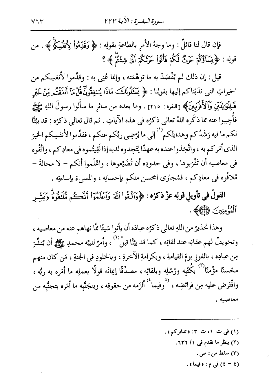 فَإِنْ قَالَ لَنَا قَائِلٌ: وَمَا وَجْهُ الْأَمْرِ بِالطَّاعَةِ بِقَوْلِهِ: {وَقَدِّمُوا لِأَنْفُسِكُمْ} [البقرة: 223] مِنْ قَوْلِهِ: {نِسَاؤُكُمْ حَرْثٌ لَكُمْ فَأْتُوا حَرْثَكُمْ أَنَّى شِئْتُمْ} [البقرة: 223] قِيلَ: إِنَّ ذَلِكَ لَمْ يُقْصَدْ بِهِ مَا تَوَهَّمْتَهُ، وَإِنَّمَا عَنَى بِهِ وَقَدِّمُوا لِأَنْفُسِكُمْ مِنَ الْخَيْرَاتِ الَّتِي نَدَبْنَاكُمْ إِلَيْهَا بِقَوْلِنَا: {يَسْأَلُونَكَ مَاذَا يُنْفِقُونَ قُلْ مَا أَنْفَقْتُمْ مِنْ خَيْرٍ فَلِلْوَالِدَيْنِ وَالْأَقْرَبِينَ} [البقرة: 215] وَمَا بَعْدَهُ مِنْ سَائِرِ مَا سَأَلُوا رَسُولَ اللَّهِ صَلَّى اللهُ عَلَيْهِ وَسَلَّمَ، فَأَجِيبُوا عَنْهُ مِمَّا ذَكَرَهُ اللَّهُ تَعَالَى ذِكْرُهُ فِي هَذِهِ الْآيَاتِ، ثُمَّ قَالَ تَعَالَى ذِكْرُهُ: قَدْ بَيَّنَّا لَكُمْ مَا فِيهِ رُشْدُكُمْ وَهِدَايَتُكُمْ إِلَى مَا يُرْضِي رَبَّكُمْ عَنْكُمْ، فَقَدِّمُوا لِأَنْفُسِكُمُ الْخَيْرَ الَّذِي أَمَرَكُمْ بِهِ، وَاتَّخِذُوا عِنْدَهُ بِهِ عَهْدًا لِتَجِدُوهُ لَدَيْهِ إِذَا لَقِيتُمُوهُ فِي مَعَادِكُمْ، وَاتَّقُوهُ فِي مَعَاصِيهِ أَنْ تَقْرَبُوهَا وَفِي حُدُودِهِ أَنْ تُضَيِّعُوهَا، وَاعْلَمُوا أَنَّكُمْ لَا مَحَالَةَ مُلَاقُوهُ فِي مَعَادِكُمْ، فَمُجَازٍ الْمُحْسِنَ مِنْكُمْ بِإِحْسَانِهِ، وَالْمُسِيءَ بِإِسَاءَتِهِ