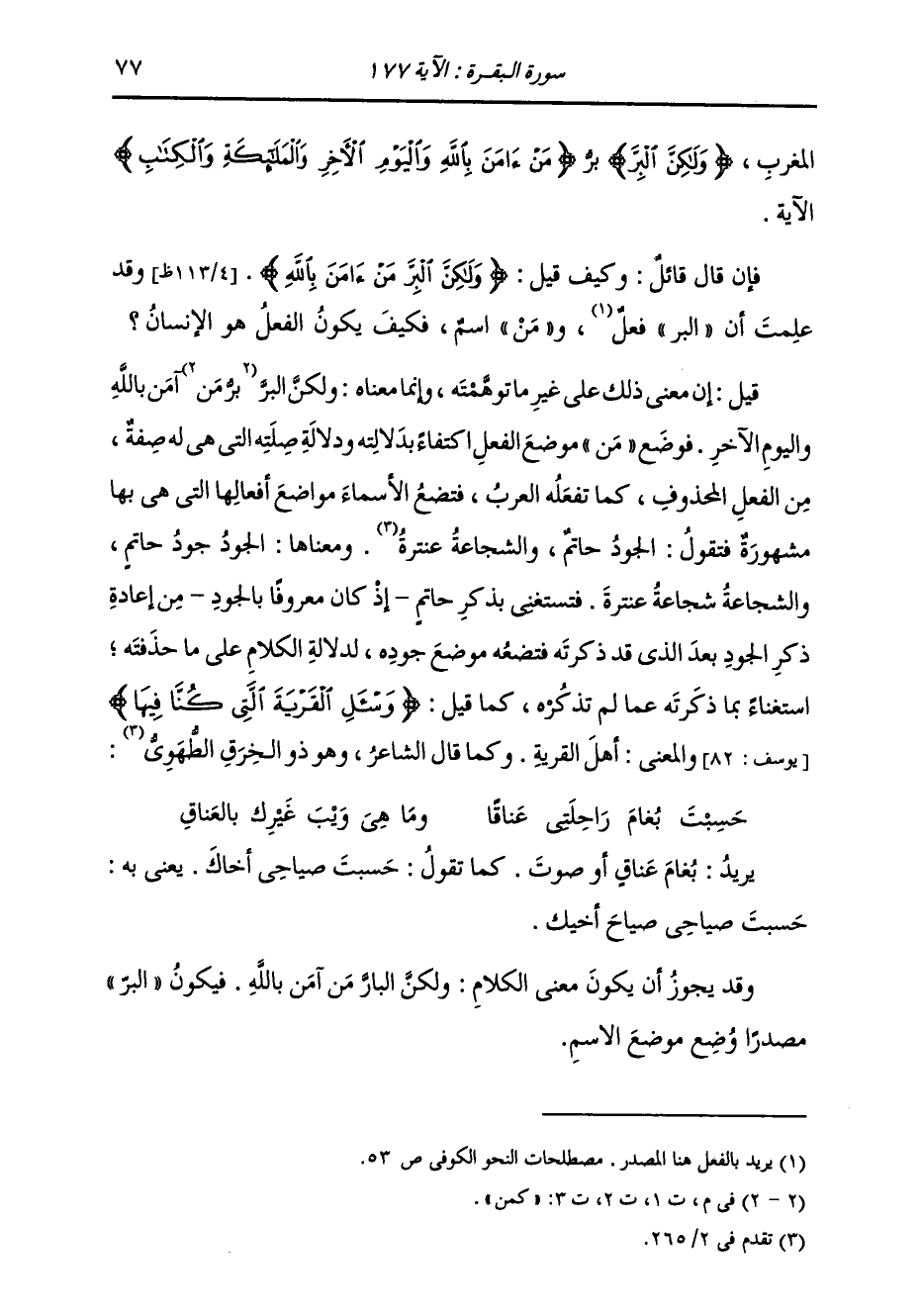 الْمَغْرِبِ {وَلَكِنَّ الْبِرَّ مَنْ آمَنَ بِاللَّهِ وَالْيَوْمِ الْآخِرِ وَالْمَلَائِكَةِ وَالْكِتَابِ} [البقرة: 177] الْآيَةَ. فَإِنْ قَالَ قَائِلٌ: فَكَيْفَ قِيلَ: {وَلَكِنَّ الْبِرَّ مَنْ آمَنَ بِاللَّهِ} [البقرة: 177] وَقَدْ عَلِمْتَ أَنَّ الْبِرَّ فِعْلٌ، وَ «مَنْ» اسْمٌ، فَكَيْفَ يَكُونُ الْفِعْلُ هُوَ الْإِنْسَانُ؟ قِيلَ: إِنَّ مَعْنَى ذَلِكَ غَيْرُ مَا تَوَهَّمْتُهُ، وَإِنَّمَا مَعْنَاهُ: وَلَكِنَّ الْبِرَّ كَمَنْ آمَنَ بِاللَّهِ وَالْيَوْمِ الْآخِرِ، فَوَضَعَ «مَنْ» مَوْضِعَ الْفِعْلِ اكْتِفَاءً بِدَلَالَتِهِ وَدَلَالَةِ صِلَتِهِ الَّتِي هِيَ لَهُ صِفَةٌ مِنَ الْفِعْلِ الْمَحْذُوفِ كَمَا تَفْعَلُهُ الْعَرَبُ فَتَضَعُ الْأَسْمَاءَ مَوَاضِعَ أَفْعَالِهَا الَّتِي هِيَ بِهَا مَشْهُورَةٌ، فَتَقُولُ: «الْجُودُ حَاتِمٌ وَالشَّجَاعَةُ عَنْتَرَةُ وَإِنَّمَا الْجُودُ حَاتِمٌ، وَالشَّجَاعَةُ عَنْتَرَةُ» ، وَمَعْنَاهَا: الْجُودُ جُودُ حَاتِمٍ فَتَسْتَغْنِي بِذِكْرِ حَاتِمٍ إِذْ كَانَ مَعْرُوفًا بِالْجُودِ مِنْ إِعَادَةِ ذِكْرِ الْجُودِ بَعْدَ الَّذِي قَدْ ذَكَرْتُهُ فَتَضَعُهُ مَوْضِعَ جُودِهِ لِدَلَالَةِ الْكَلَامِ عَلَى مَا حَذَفْتُهُ اسْتِغْنَاءً بِمَا ذَكَرْتَهُ عَمَّا لَمْ تَذْكُرْهُ، كَمَا قِيلَ: {وَاسْأَلِ الْقَرْيَةَ الَّتِي كُنَّا فِيهَا} [يوسف: 82] وَالْمَعْنَى: أَهْلَ الْقَرْيَةِ، وَكَمَا قَالَ الشَّاعِرُ، وَهُوَ ذُو الْخِرَقِ الطُّهَوِيُّ: