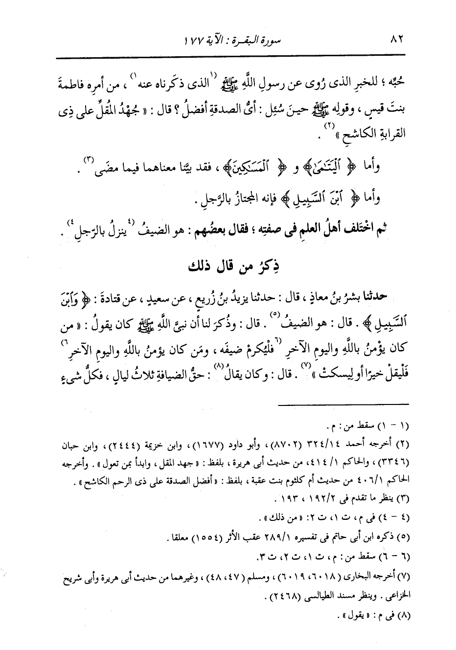 ذِكْرُ مَنْ قَالَ ذَلِكَ حَدَّثَنَا بِشْرُ بْنُ مُعَاذٍ، قَالَ: ثنا يَزِيدُ، قَالَ: ثنا سَعِيدٌ، عَنْ قَتَادَةَ: {وَابْنَ السَّبِيلِ} [البقرة: 177] قَالَ: هُوَ الضَّيْفُ قَالَ: قَدْ ذُكِرَ لَنَا أَنَّ نَبِيَّ اللَّهِ صَلَّى اللهُ عَلَيْهِ وَسَلَّمَ كَانَ يَقُولُ: «§مَنْ كَانَ يُؤْمِنُ بِاللَّهِ وَالْيَوْمِ الْآخِرِ فَلْيَقُلْ خَيْرًا أَوْ لِيَسْكُتْ»