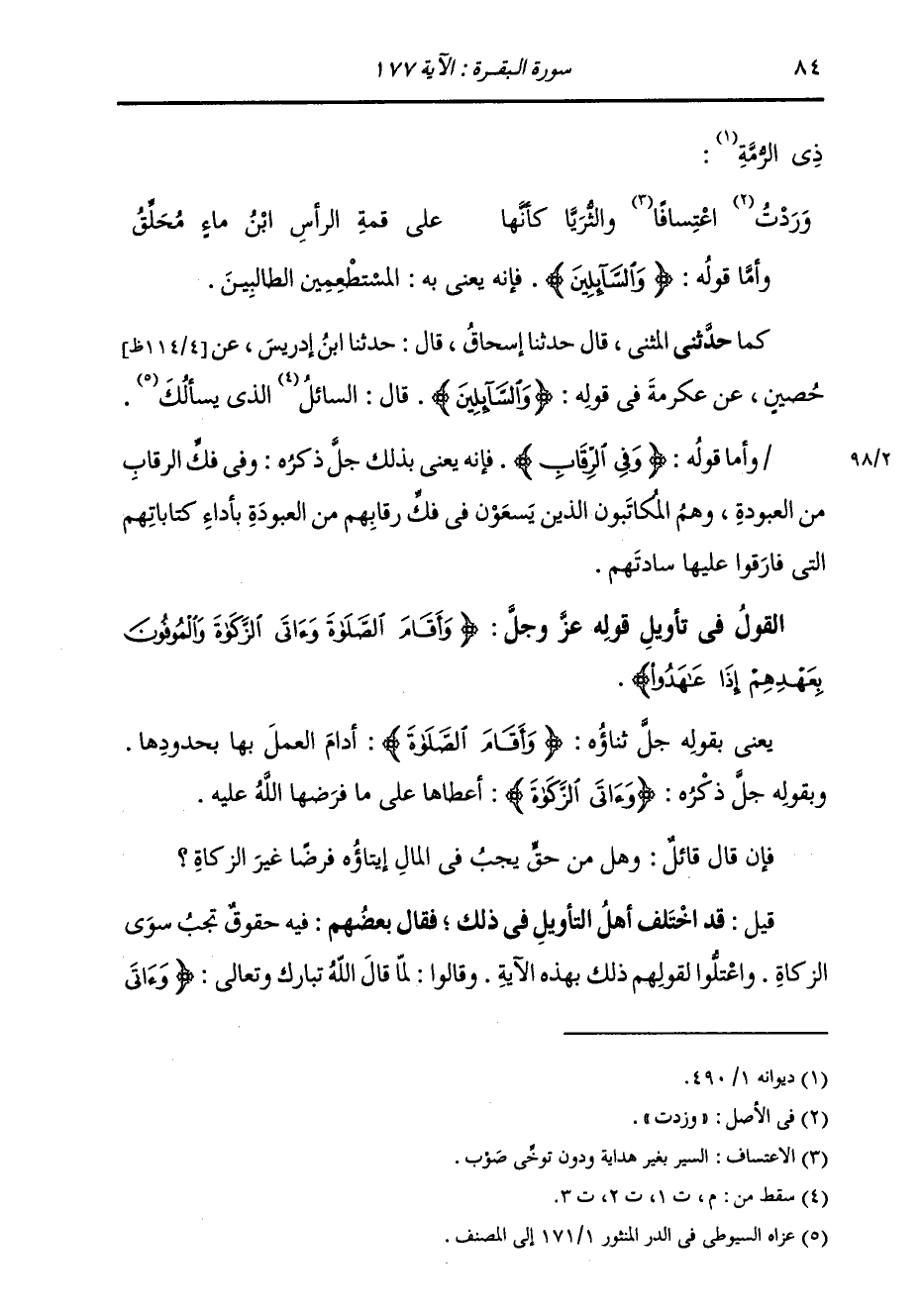 §وَأَمَّا قَوْلُهُ {وَالسَّائِلِينَ} [البقرة: 177] فَإِنَّهُ يَعْنِي بِهِ: الْمُسْتَطْعِمِينَ الطَّالِبِينَ
