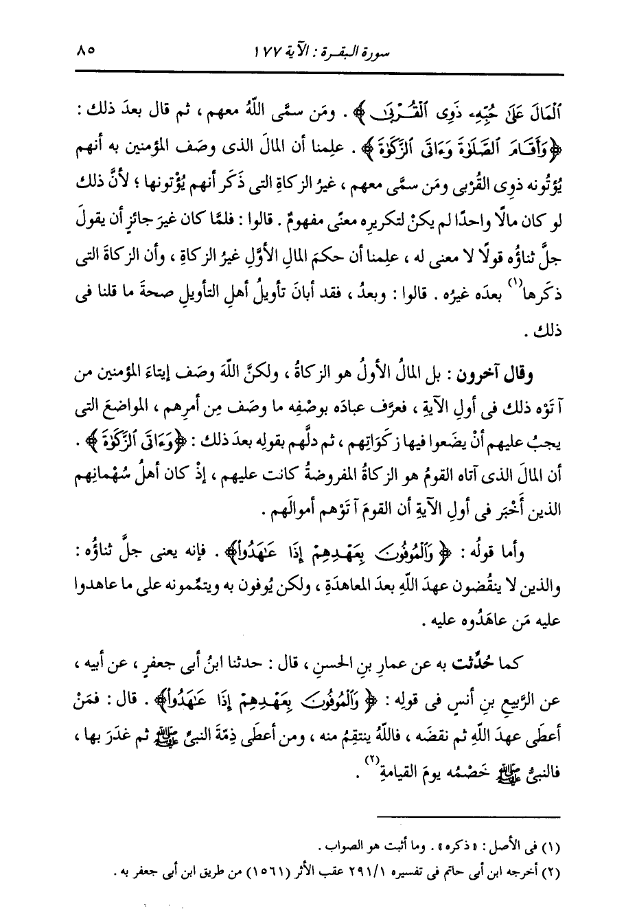 §وَأَمَّا قَوْلُهُ: {وَالْمُوفُونَ بِعَهْدِهِمْ إِذَا عَاهَدُوا} [البقرة: 177] فَإِنْ يَعْنِي تَعَالَى ذِكْرُهُ: وَالَّذِينَ لَا يَنْقُضُونَ عَهْدَ اللَّهِ بَعْدَ الْمُعَاهَدَةِ، وَلَكِنْ يُوفُونَ بِهِ وَيُتِمُّونَهُ عَلَى مَا عَاهَدُوا عَلَيْهِ مَنْ عَاهَدُوهُ عَلَيْهِ