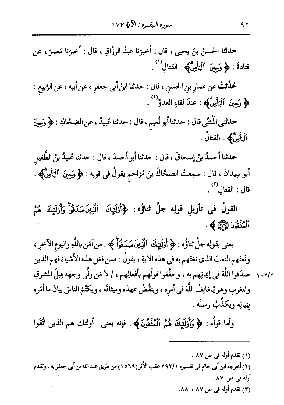 حُدِّثْتُ عَنْ عَمَّارِ بْنِ الْحَسَنِ، قَالَ: ثنا ابْنُ أَبِي جَعْفَرٍ، عَنْ أَبِيهِ، عَنِ الرَّبِيعِ، " {§وَحِينَ الْبَأْسِ} [البقرة: 177] عِنْدَ لِقَاءِ الْعَدُوِّ "