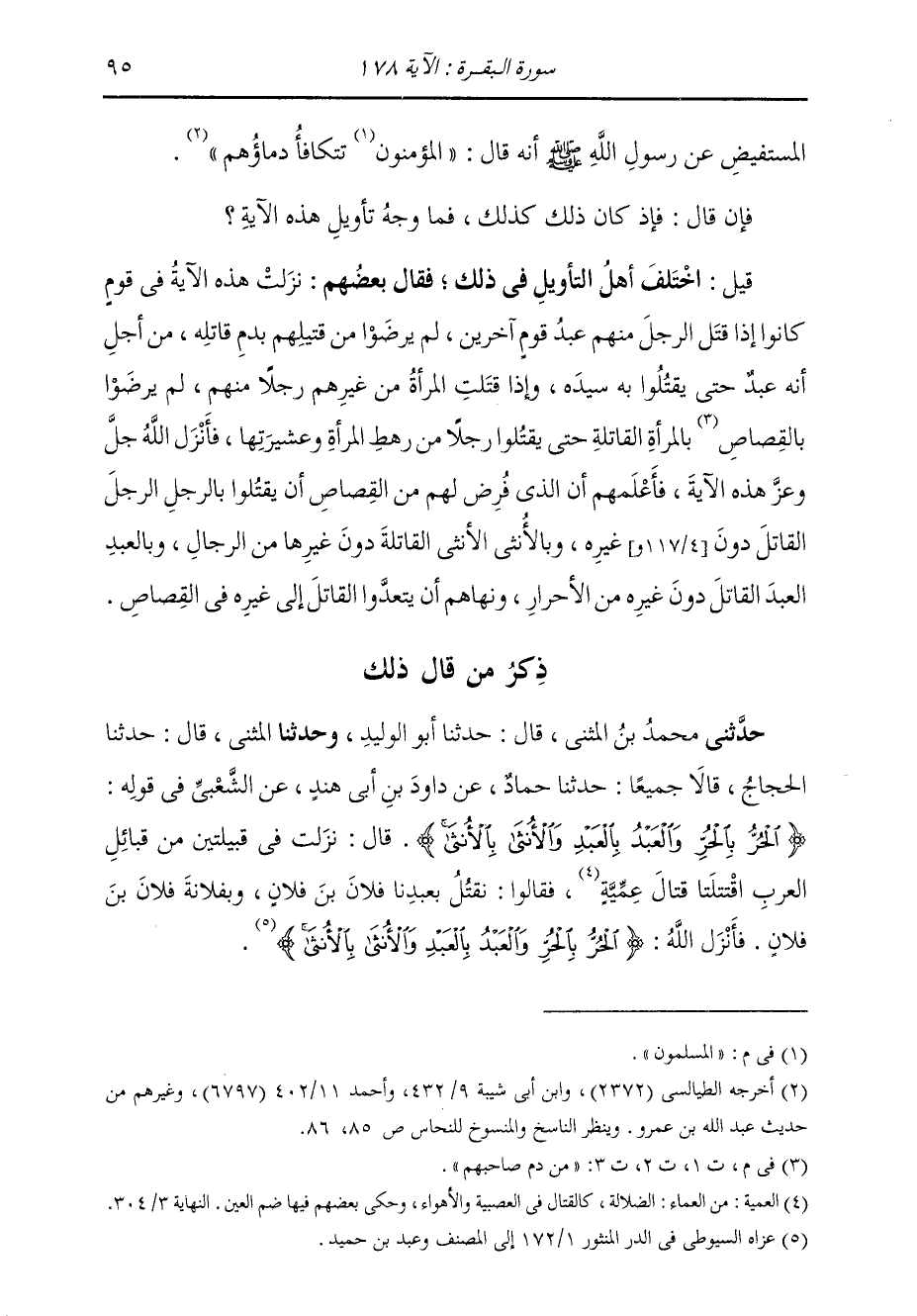 ذِكْرُ مَنْ قَالَ ذَلِكَ حَدَّثَنِي مُحَمَّدُ بْنُ الْمُثَنَّى، قَالَ: ثنا أَبُو الْوَلِيدِ، وَحَدَّثَنِي الْمُثَنَّى، قَالَ: ثنا الْحَجَّاجُ، قَالَا: ثنا حَمَّادٌ، عَنْ دَاوُدَ بْنِ أَبِي هِنْدٍ، عَنِ الشَّعْبِيِّ، فِي قَوْلِهِ: {§الْحُرُّ بِالْحُرِّ وَالْعَبْدُ بِالْعَبْدِ وَالْأُنْثَى بِالْأُنْثَى} [البقرة: 178] قَالَ " نَزَلَتْ فِي قَبِيلَتَيْنِ مِنْ قَبَائِلِ الْعَرَبِ اقْتَتَلَتَا قِتَالَ عِمِّيَّةٍ، فَقَالُوا: نَقْتُلُ بعَبْدِنَا فُلَانٍ ابْنَ فُلَانٍ، وَبِفُلَانَةَ فُلَانٍ ابْنَ فُلَانٍ فَأَنْزَلَ اللَّهُ: {الْحُرُّ بِالْحُرِّ وَالْعَبْدُ بِالْعَبْدِ وَالْأُنْثَى بِالْأُنْثَى} [البقرة: 178] "