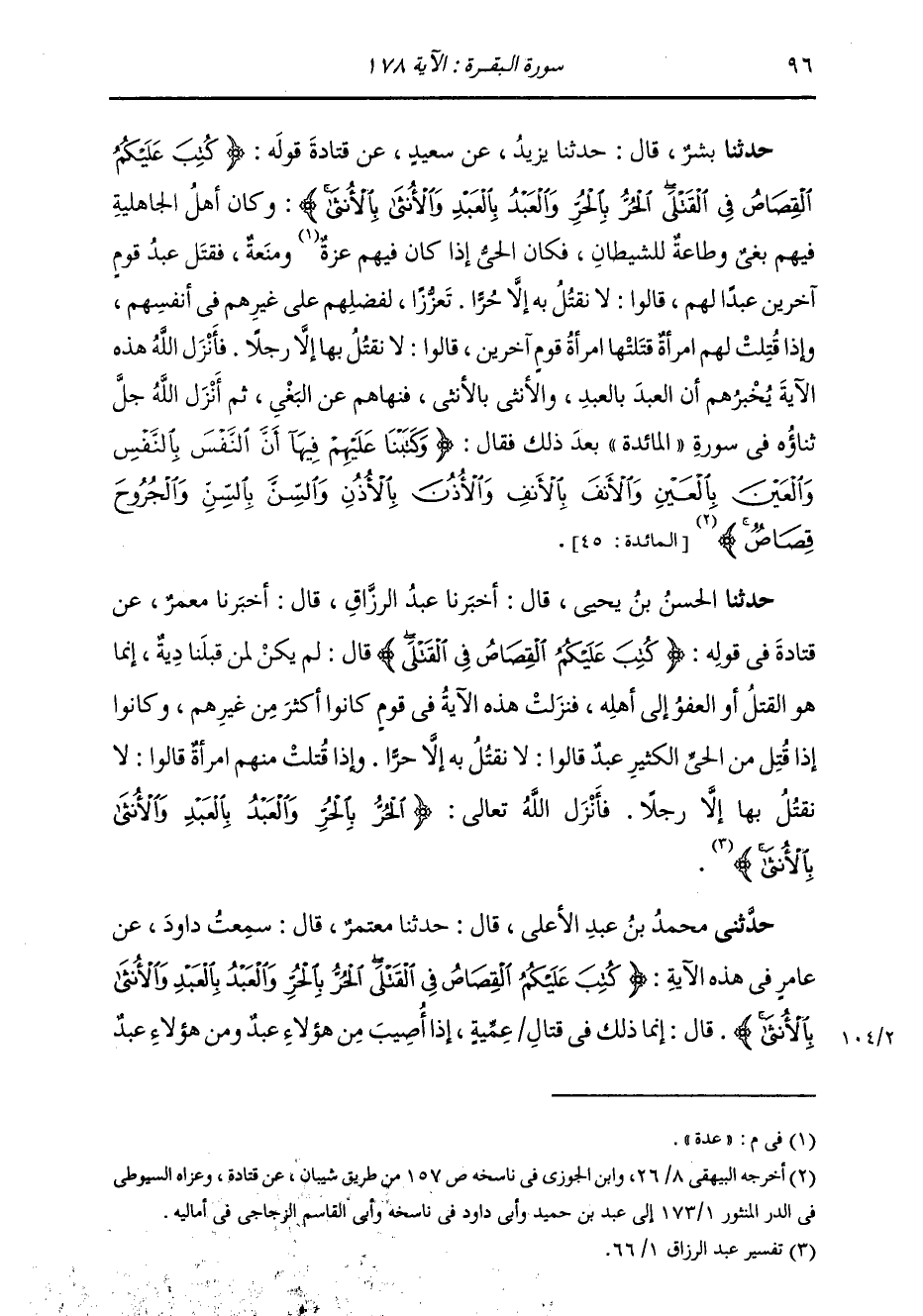حَدَّثَنَا بِشْرٌ، قَالَ: ثنا يَزِيدُ، قَالَ: ثنا سَعِيدٌ، عَنْ قَتَادَةَ، قَوْلِهِ: {§كُتِبَ عَلَيْكُمُ الْقِصَاصُ فِي الْقَتْلَى الْحُرُّ بِالْحُرِّ وَالْعَبْدُ بِالْعَبْدِ وَالْأُنْثَى بِالْأُنْثَى} [البقرة: 178] قَالَ " كَانَ أَهْلُ الْجَاهِلِيَّةِ فِيهِمْ بَغْيٌ وَطَاعَةٌ لِلشَّيْطَانِ، فَكَانَ الْحَيُّ إِذَا كَانَ فِيهِمْ عِدَّةٌ وَمَنَعَةٌ، فَقَتَلَ عَبْدُ قَوْمٍ آخَرِينَ عَبْدًا لَهُمْ، قَالُوا: لَا نَقْتُلُ بِهِ إِلَّا حُرًّا؛ تَعَزُّزًا لِفَضْلِهِمْ عَلَى غَيْرِهِمْ فِي أَنْفُسِهِمْ، وَإِذَا قُتِلَتْ لَهُمُ امْرَأَةٌ قَتَلَتْهَا امْرَأَةُ قَوْمٍ آخَرِينَ، قَالُوا: لَا نَقْتُلُ بِهَا إِلَّا رَجُلًا. فَأَنْزَلَ اللَّهُ هَذِهِ الْآيَةَ يُخْبِرُهُمْ أَنَّ الْعَبْدَ بِالْعَبْدِ وَالْأُنْثَى بِالْأُنْثَى، فَنَهَاهُمْ عَنِ الْبَغْيِ. ثُمَّ أَنْزَلَ اللَّهُ تَعَالَى ذِكْرُهُ فِي سُورَةِ الْمَائِدَةِ بَعْدَ ذَلِكَ فَقَالَ: {وَكَتَبْنَا عَلَيْهِمْ فِيهَا أَنَّ النَّفْسَ بِالنَّفْسِ وَالْعَيْنَ بِالْعَيْنِ وَالْأَنْفَ بِالْأَنْفِ وَالْأُذُنَ بِالْأُذُنِ وَالسِّنَّ بِالسِّنِّ وَالْجُرُوحَ قِصَاصٌ} [المائدة: 45] "