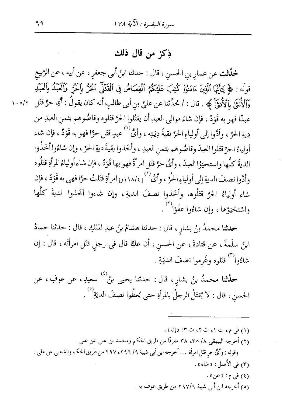 ذِكْرُ مَنْ قَالَ ذَلِكَ , حُدِّثْتُ عَنْ عَمَّارِ بْنِ الْحَسَنِ، قَالَ: ثنا ابْنُ أَبِي جَعْفَرٍ، عَنْ أَبِيهِ، عَنِ الرَّبِيعِ، قَوْلُهُ: {§يَا أَيُّهَا الَّذِينَ آمَنُوا كُتِبَ عَلَيْكُمُ الْقِصَاصُ فِي الْقَتْلَى الْحُرُّ بِالْحُرِّ وَالْعَبْدُ بِالْعَبْدِ وَالْأُنْثَى بِالْأُنْثَى} [البقرة: 178] قَالَ: حُدِّثْنَا عَنْ عَلِيِّ بْنِ أَبِي طَالِبٍ، أَنَّهُ كَانَ يَقُولُ: «أَيُّمَا حُرٍّ قَتَلَ عَبْدًا فَهُوَ قَوَدٌ بِهِ، فَإِنْ شَاءَ مَوَالِي الْعَبْدِ أَنْ يَقْتُلُوا الْحُرَّ قَتَلُوهُ، وَقَاصُّوهُمْ بِثَمَنِ الْعَبْدِ مِنْ دِيَةِ الْحُرِّ، وَأَدُّوا إِلَى أَوْلِيَاءِ الْحُرِّ بَقِيَّةَ دِيَتِهِ. وَإِنَّ عَبْدٌ قَتَلَ حُرًّا فَهُوَ بِهِ قَوَدٌ، فَإِنْ شَاءَ أَوْلِيَاءُ الْحُرِّ قَتَلُوا الْعَبْدَ وَقَاصُّوهُمْ بِثَمَنِ الْعَبْدِ وَأَخَذُوا بَقِيَّةَ دِيَةِ الْحُرِّ، وَإِنْ شَاءُوا أَخَذُوا الدِّيَةَ كُلَّهَا وَاسْتَحْيُوا الْعَبْدَ. وَأَيُّ حُرٍّ قَتَلَ امْرَأَةً فَهُوَ بِهَا قَوَدٌ، فَإِنْ شَاءَ أَوْلِيَاءُ الْمَرْأَةِ قَتَلُوهُ وَأَدَّوْا نِصْفَ الدِّيَةِ إِلَى أَوْلِيَاءِ الْحُرِّ. وَإِنِ امْرَأَةٌ قَتَلَتْ حُرًّا فَهِيَ بِهِ قَوَدٌ، فَإِنْ شَاءَ أَوْلِيَاءُ الْحُرِّ قَتَلَوهَا وَأَخَذُوا نِصْفَ الدِّيَةِ، وَإِنْ شَاءُوا أَخَذُوا الدِّيَةَ كُلَّهَا وَاسْتَحْيَوْهَا وَإِنْ شَاءُوا عَفَوْا»