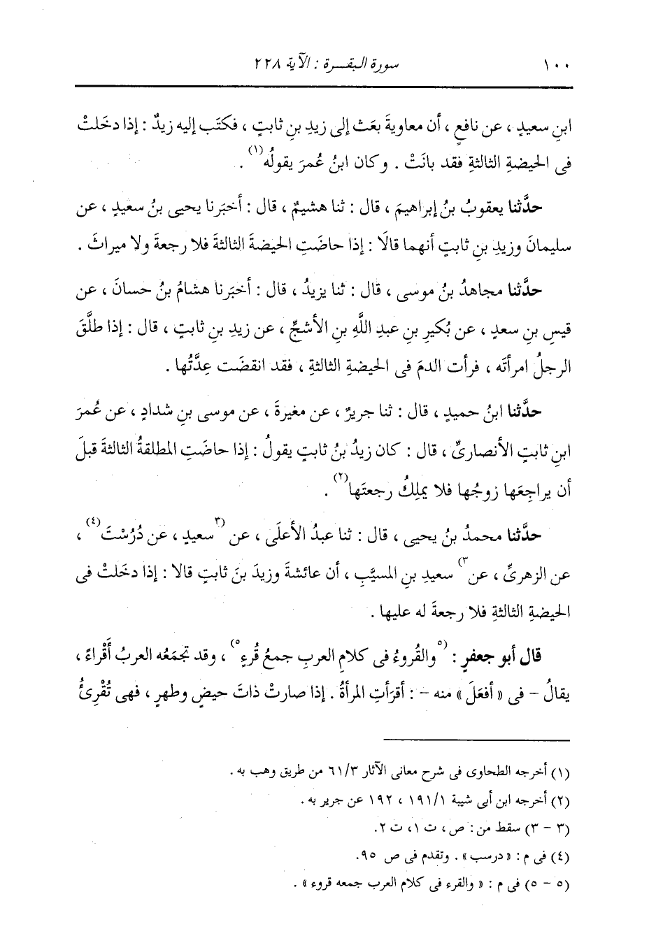 حَدَّثَنَا مُحَمَّدُ بْنُ يَحْيَى، قَالَ: ثنا عَبْدُ الْأَعْلَى، عَنْ سَعِيدٍ، عَنْ دُرُسْتٍ، عَنِ الزُّهْرِيِّ، عَنْ سَعِيدِ بْنِ الْمُسَيِّبِ، أَنَّ عَائِشَةَ، وَزَيْدَ بْنَ ثَابِتٍ، قَالَا: «§إِذَا دَخَلَتْ فِي الْحَيْضَةِ الثَّالِثَةِ فَلَا رَجْعَةَ لَهُ عَلَيْهَا» قَالَ أَبُو جَعْفَرٍ: وَالْقَرْءُ فِي كَلَامِ الْعَرَبِ: جَمْعُهُ قُرُوءٌ، وَقَدْ تَجْمَعُهُ الْعَرَبُ أَقْرَاءً، يُقَالُ فِي أَفْعَلَ مِنْهُ: أَقْرَأَتِ الْمَرْأَةُ: إِذَا صَارَتْ ذَاتَ حِيَضٍ، وَطُهْرٍ، فَهِيَ تُقْرِئَ -[101]- إِقْرَاءً. وَأَصْلُ الْقَرْءِ فِي كَلَامِ الْعَرَبِ: الْوَقْتُ لِمَجِيءِ الشَّيْءِ الْمُعْتَادِ مَجِيئُهُ لِوَقْتٍ مَعْلُومٍ، وَلِإِدْبَارِ الشَّيْءِ الْمُعْتَادِ إِدْبَارُهُ لِوَقْتٍ مَعْلُومٍ؛ وَلِذَلِكَ قَالَتِ الْعَرَبُ: أَقْرَأَتْ حَاجَةُ فُلَانٍ عِنْدِي، بِمَعْنَى دَنَا قَضَاؤُهَا، وَجَاءَ وَقْتُ قَضَائِهَا؛ وَأَقْرَأَ النَّجْمُ: إِذَا جَاءَ وَقْتُ أُفُولِهِ، وَأَقْرَأَ: إِذَا جَاءَ وَقْتُ طُلُوعِهِ، كَمَا قَالَ الشَّاعِرُ: