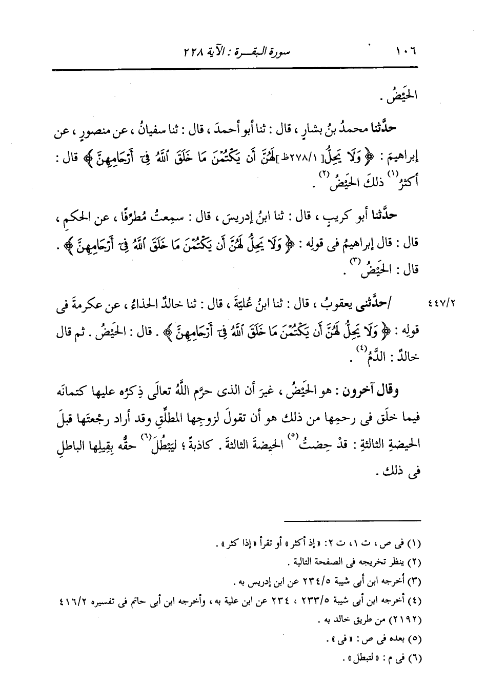حَدَّثَنَا مُحَمَّدُ بْنُ بَشَّارٍ قَالَ: ثنا أَبُو أَحْمَدَ قَالَ: ثنا سُفْيَانُ، عَنْ مَنْصُورٍ، عَنْ إِبْرَاهِيمَ: " {§وَلَا يَحِلُّ لَهُنَّ أَنْ يَكْتُمْنَ مَا خَلَقَ اللَّهُ فِي أَرْحَامِهِنَّ} [البقرة: 228] قَالَ: أَكْثَرُ ذَلِكَ الْحَيْضُ "