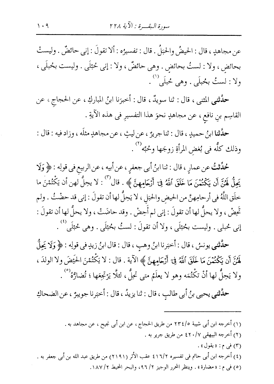 حَدَّثَنِي يُونُسُ، قَالَ: أَخْبَرَنَا ابْنُ وَهْبٍ، قَالَ: قَالَ ابْنُ زَيْدٍ فِي قَوْلِهِ: " {§وَلَا يَحِلُّ لَهُنَّ أَنْ يَكْتُمْنَ مَا خَلَقَ اللَّهُ فِي أَرْحَامِهِنَّ} [البقرة: 228] الْآيَةَ، قَالَ: لَا يَكْتُمْنَ الْحَيْضَ، وَلَا الْوَلَدَ، وَلَا يَحِلُّ لَهَا أَنْ تَكْتُمَهُ وَهُوَ لَا يَعْلَمُ مَتَى تَحِلُّ لِئَلَّا يَرْتَجِعَهَا مُضَارَّةً "