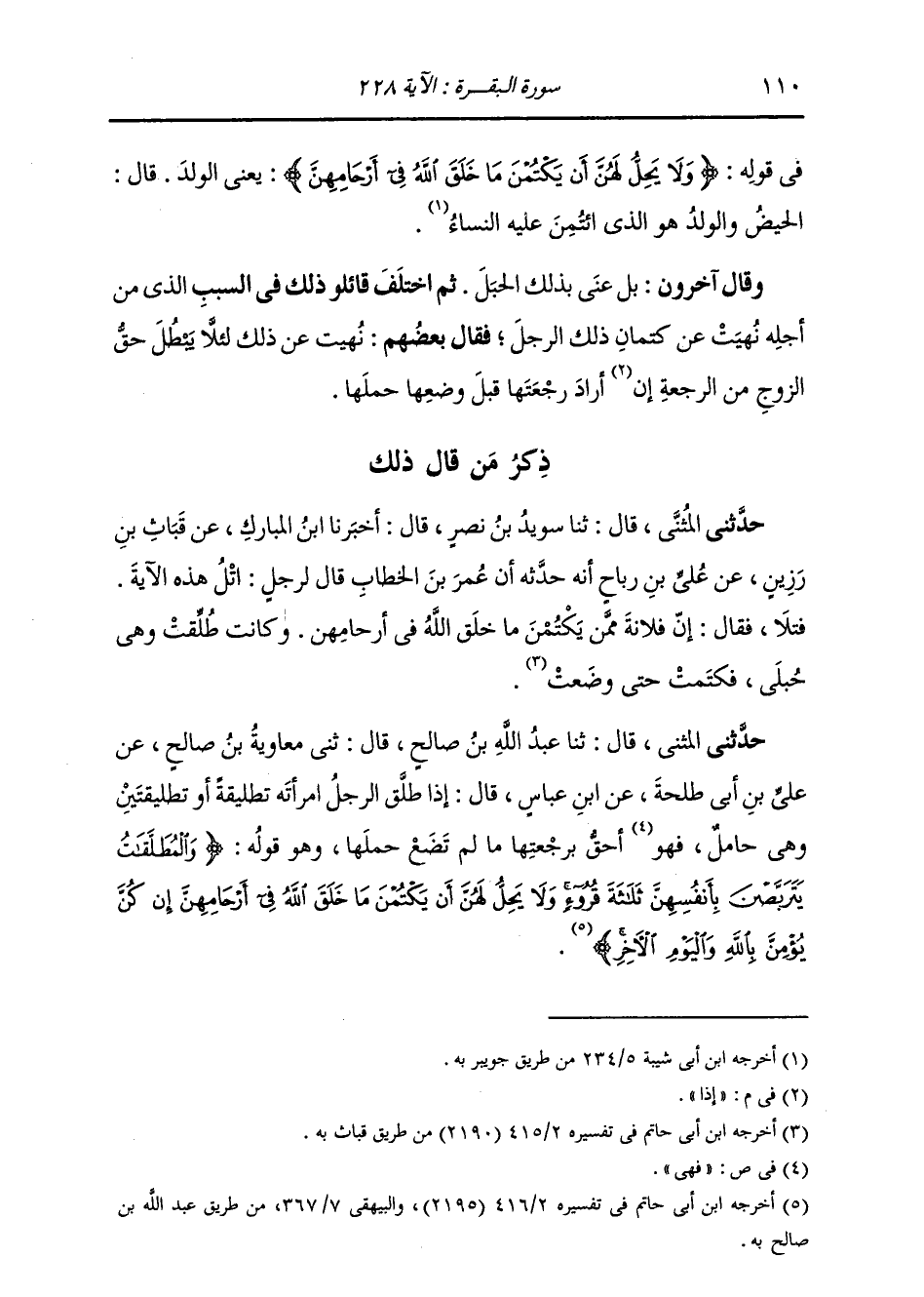 ذِكْرُ مَنْ قَالَ ذَلِكَ حَدَّثَنِي الْمُثَنَّى، قَالَ: ثنا سُوَيْدُ بْنُ نَصْرٍ، قَالَ: أَخْبَرَنَا ابْنُ الْمُبَارَكِ، عَنْ قَبَاثِ بْنِ رَزِينٍ، عَنْ عَلِيِّ بْنِ رَبَاحٍ، أَنَّهُ حَدَّثَهُ، أَنَّ عُمَرَ بْنَ الْخَطَّابِ قَالَ لِرَجُلٍ: اتْلُ هَذِهِ الْآيَةَ فَتَلَا. فَقَالَ: «إِنَّ §فُلَانَةَ مِمَّنْ يَكْتُمْنَ مَا خَلَقَ اللَّهُ فِي أَرْحَامِهِنَّ. وَكَانَتْ طُلِّقَتْ وَهِيَ حُبْلَى، فَكَتَمَتْ حَتَّى وَضَعَتْ»