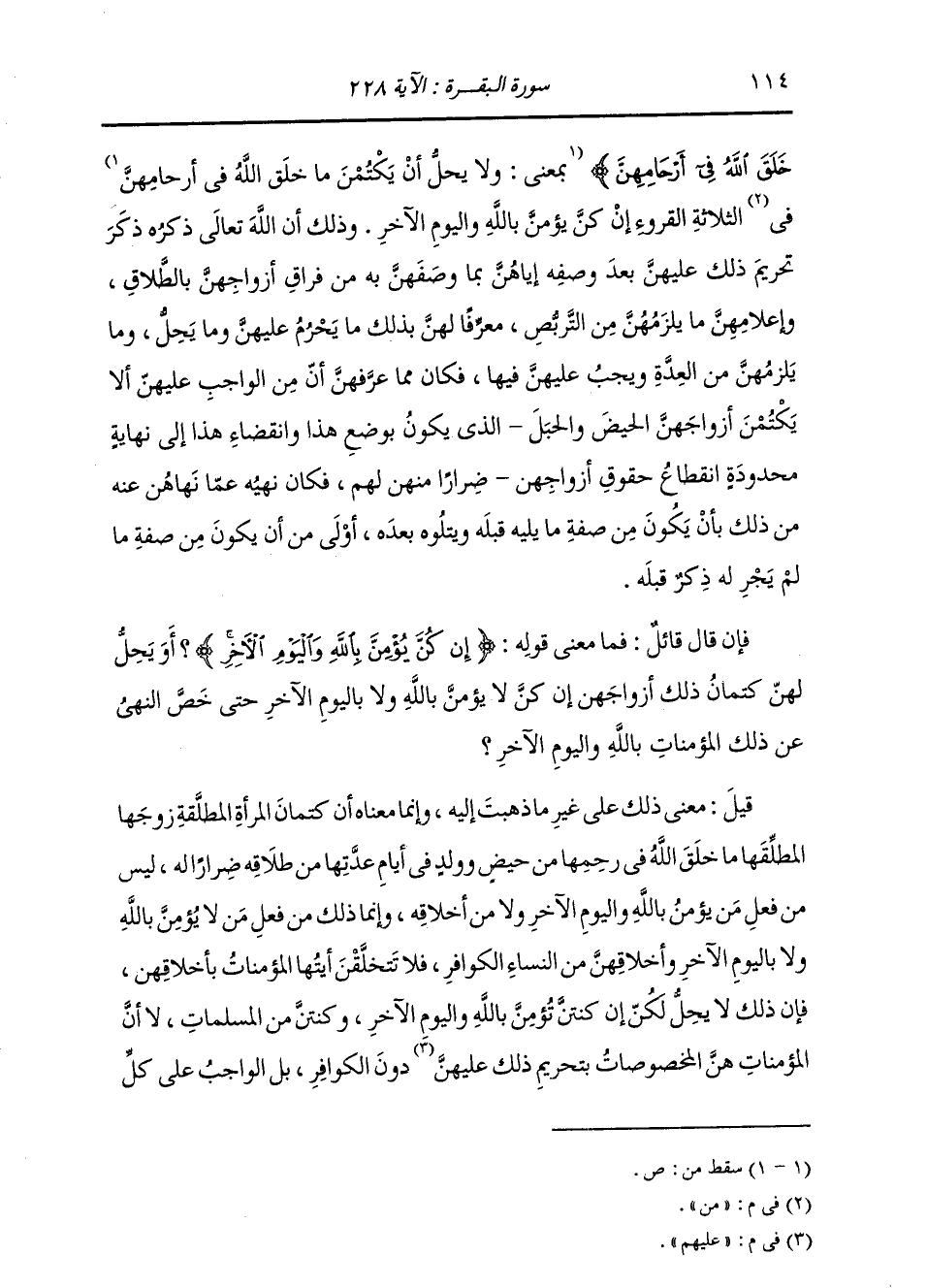 خَلَقَ اللَّهُ فِي أَرْحَامِهِنَّ} [البقرة: 228] بِمَعْنَى: وَلَا يَحِلُّ أَنْ يَكْتُمْنَ مَا خَلَقَ اللَّهُ فِي أَرْحَامِهِنَّ مِنَ الثَّلَاثَةِ الْقُرُوءِ إِنْ كُنَّ يُؤْمِنَّ بِاللَّهِ وَالْيَوْمِ الْآخِرِ. وَذَلِكَ أَنَّ اللَّهَ تَعَالَى ذِكْرُهُ ذَكَرَ تَحْرِيمَ ذَلِكَ عَلَيْهِنَّ بَعْدَ وَصْفِهِ إِيَّاهُنَّ بِمَا وَصَفَهُنَّ بِهِ مِنْ فِرَاقِ أَزْوَاجِهِنَّ بِالطَّلَاقِ، وَإِعْلَامِهِنَّ مَا يَلْزَمُهُنَّ مِنَ التَّرَبُّصِ مُعَرِّفًا لَهُنَّ بِذَلِكَ مَا يَحْرُمُ عَلَيْهِنَّ وَمَا يَحِلُّ، وَمَا يَلْزَمُهُنَّ مِنَ الْعِدَّةِ وَيَجِبُ عَلَيْهِنَّ فِيهَا، فَكَانَ مِمَّا عَرَّفَهُنَّ أَنَّ مِنَ الْوَاجِبِ عَلَيْهِنَّ أَنْ لَا يَكْتُمْنَ أَزْوَاجَهُنَّ الْحَيْضَ، وَالْحَبَلَ الَّذِي يَكُونُ بِوَضْعِ هَذَا، وَانْقِضَاءِ هَذَا إِلَى نِهَايَةٍ مَحْدُودَةٍ، انْقِطَاعُ حُقُوقِ أَزْوَاجِهِنَّ ضِرَارٌ مِنْهُنَّ لَهُمْ، فَكَانَ نَهْيُهُ عَمَّا نَهَاهُنَّ عَنْهُ مِنْ ذَلِكَ بِأَنْ يَكُونَ مِنْ صِفَةِ مَا يَلِيهِ قِبَلَهُ وَيَتْلُوهُ بَعْدَهُ، أَوْلَى مِنْ أَنْ يَكُونَ مِنْ صِفَةِ مَا لَمْ يَجْرِ لَهُ ذِكْرٌ قَبْلَهُ. فَإِنْ قَالَ قَائِلٌ: مَا مَعْنَى قَوْلِهِ: {إِنْ كُنَّ يُؤْمِنَّ بِاللَّهِ وَالْيَوْمِ الْآخِرِ} [البقرة: 228] أَوْ يَحِلُّ لَهُنَّ كِتْمَانُ ذَلِكَ أَزْوَاجَهُنَّ إِنْ كُنَّ لَا يُؤْمِنُ بِاللَّهِ، وَلَا بِالْيَوْمِ الْآخِرِ حَتَّى خَصَّ النَّهْيَ عَنْ ذَلِكَ الْمُؤْمِنَاتِ بِاللَّهِ وَالْيَوْمِ الْآخِرِ؟ قِيلَ: مَعْنَى ذَلِكَ عَلَى غَيْرِ مَا ذَهَبْتُ إِلَيْهِ، وَإِنَّمَا مَعْنَاهُ: أَنَّ كِتْمَانَ الْمَرْأَةِ الْمُطَلَّقَةِ زَوْجَهَا الْمُطَلِّقَهَا مَا خَلَقَ اللَّهُ تَعَالَى فِي رَحِمِهَا مِنْ حَيْضٍ، وَوَلَدٍ فِي أَيَّامِ عِدَّتِهَا مِنْ طَلَاقِهِ ضِرَارًا لَهُ لَيْسَ مِنْ فِعْلِ مَنْ يُؤْمِنُ بِاللَّهِ، وَالْيَوْمِ الْآخِرِ، وَلَا مِنْ أَخْلَاقِهِ، وَإِنَّمَا ذَلِكَ مِنْ فِعْلِ مَنْ لَا يُؤْمِنُ بِاللَّهِ، وَلَا بِالْيَوْمِ الْآخِرِ، وَأَخْلَاقُهُنَّ مِنَ النِّسَاءِ الْكَوَافِرِ فَلَا تَتَخَلَّقْنَ أَيَّتُهَا الْمُؤْمِنَاتُ بِأَخْلَاقِهِنَّ، فَإِنَّ ذَلِكَ لَا يَحِلُّ لَكِنْ إِنْ كُنْتُنَّ تُؤْمِنَّ بِاللَّهِ، وَالْيَوْمِ الْآخِرِ وَكُنْتُنَّ مِنَ الْمُسْلِمَاتِ؛ لَا أَنُّ الْمُؤْمِنَاتِ هُنَّ الْمَخْصُوصَاتُ بِتَحْرِيمِ ذَلِكَ عَلَيْهِنَّ دُونَ الْكَوَافِرِ، بَلِ الْوَاجِبُ عَلَى كُلِّ