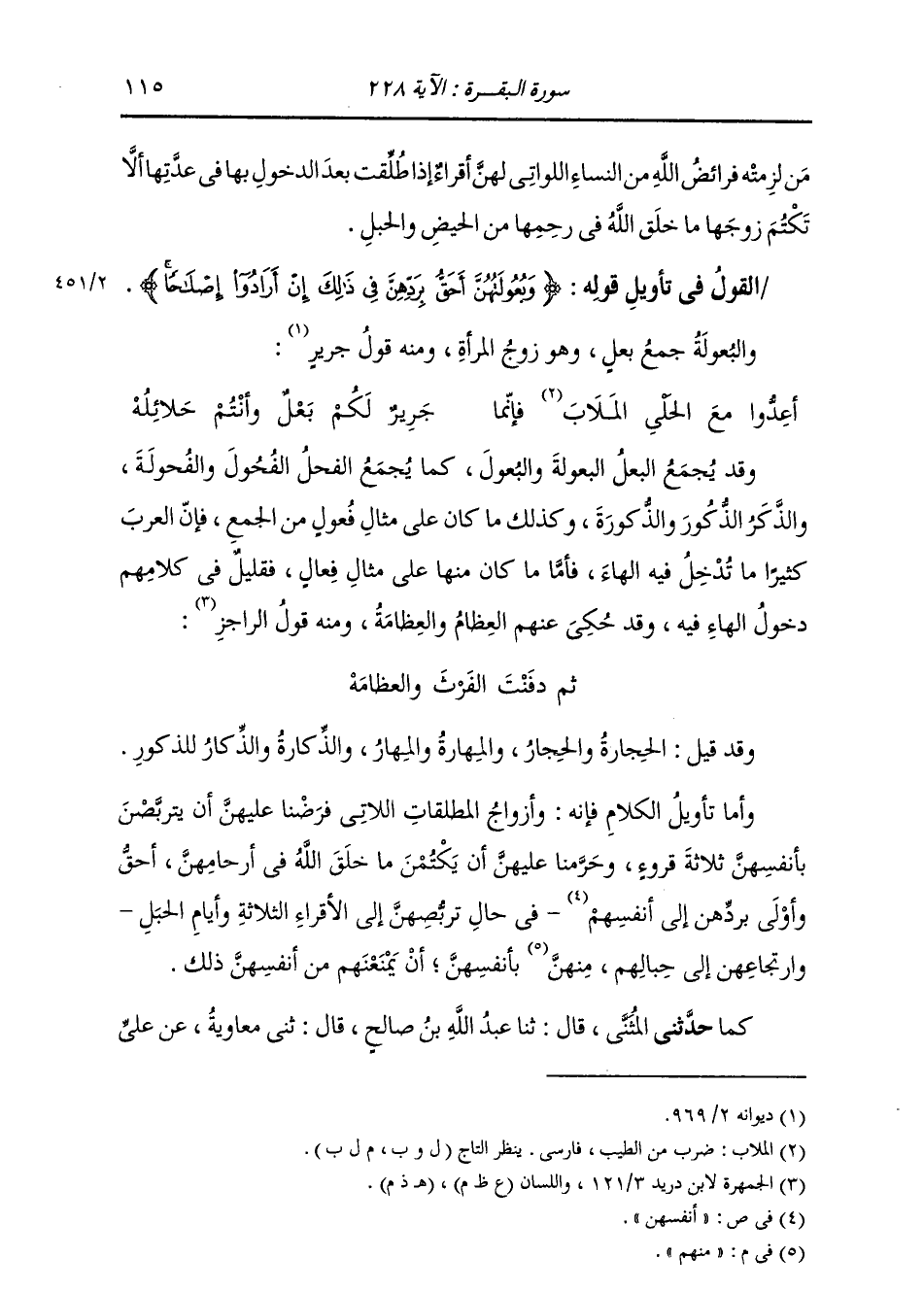 وَقَدْ يُجْمَعُ الْبَعْلُ الْبُعُولَةَ وَالْبُعُولَ، كَمَا يُجْمَعُ الْفَحْلُ وَالْفُحُولَ وَالْفُحُولَةَ، وَالذَّكَرُ الذُّكُورَ وَالذُّكُورَةَ وَكَذَلِكَ مَا كَانَ عَلَى مِثَالِ «فَعُولٍ» مِنَ الْجَمْعِ، فَإِنَّ الْعَرَبَ كَثِيرًا مَا تُدْخِلُ فِيهِ الْهَاءَ، فَأَمَّا مَا كَانَ مِنْهَا عَلَى مِثَالِ «فِعَالٍ» فَقَلِيلٌ فِي كَلَامِهِمْ دُخُولُ الْهَاءِ فِيهِ، وَقَدْ حُكِيَ عَنْهُمُ الْعِظَامُ وَالْعِظَامَةُ، وَمِنْهُ قَوْلُ الرَّاجِزِ: ثُمَّ دَفَنْتَ الْفَرْثَ، وَالْعِظَامَهْ وَقَدْ قِيلَ: الْحِجَارَةُ وَالْحِجَارُ، وَالْمِهَارَةُ وَالْمِهَارُ، وَالذِّكَاةُ وَالذِّكَارُ، لِلذُّكُورِ. وَأَمَّا تَأْوِيلُ الْكَلَامِ، فَإِنَّهُ: أَزْوَاجُ الْمُطَلَّقَاتِ اللَّاتِي فَرَضْنَا عَلَيْهِنَّ أَنْ يَتَرَبَّصْنَ بِأَنْفُسِهِنَّ ثَلَاثَةَ قُرُوءٍ، وَحَرَّمْنَا عَلَيْهِنَّ أَنْ يَكْتُمْنَ مَا خَلَقَ اللَّهُ فِي أَرْحَامِهِنَّ، أَحَقُّ وَأَوْلَى بِرَدِّهِنَّ إِلَى أَنْفُسِهِمْ فِي حَالِ تَرَبُّصِهِنَّ إِلَى الْأَقْرَاءِ الثَّلَاثَةِ، وَأَيَّامِ الْحَبَلِ، وَارْتِجَاعِهِنَّ إِلَى حِبَالِهِنَّ مِنْهُمْ بِأَنْفُسِهِنَّ أَنْ يَمْنَعَهُنَّ مِنْ أَنْفُسِهِنَّ ذَلِكَ
