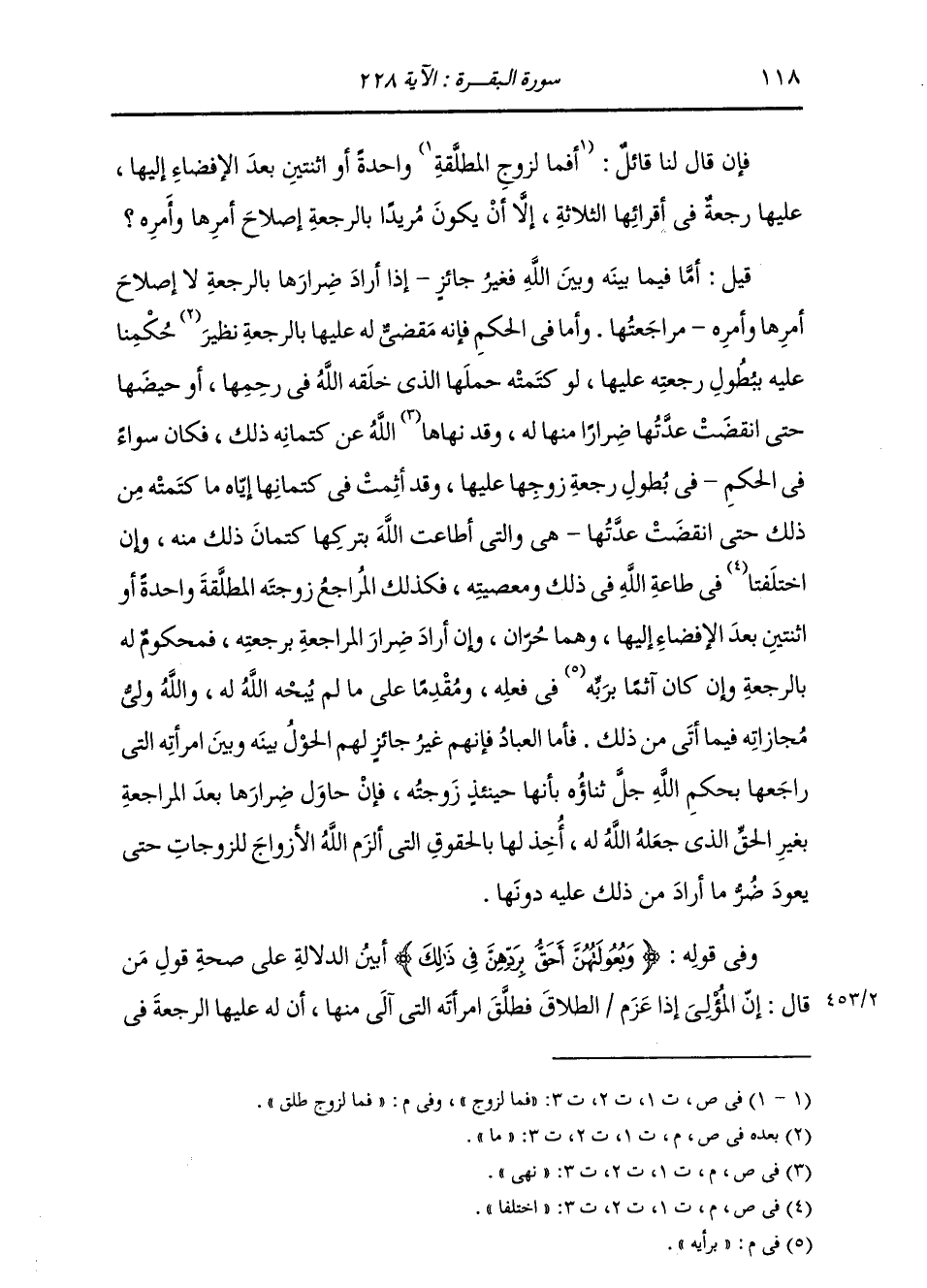 فَإِنْ قَالَ لَنَا قَائِلٌ: فَمَا لِزَوْجٍ طَلَّقَ وَاحِدَةً أَوِ اثْنَتَيْنِ بَعْدَ الْإِفْضَاءِ إِلَيْهَا عَلَيْهَا رَجْعَةٌ فِي أَقْرَائِهَا الثَّلَاثَةِ، إِلَّا أَنْ يَكُونَ مُرِيدًا بِالرَّجْعَةِ إِصْلَاحَ أَمْرِهَا وَأَمْرِهِ؟ قِيلَ: أَمَا فِيمَا بَيْنَهُ وَبَيْنَ اللَّهِ تَعَالَى فَغَيْرُ جَائِزٍ إِذَا أَرَادَ ضِرَارَهَا بِالرَّجْعَةِ لَا إِصْلَاحَ أَمْرِهَا وَأَمْرِهِ مُرَاجَعَتُهَا. وَأَمَّا فِي الْحُكْمِ فَإِنَّهُ مَقْضِيُّ لَهُ عَلَيْهَا بِالرَّجْعَةِ نَظِيرَ مَا حَكَمْنَا عَلَيْهِ بِبُطُولِ رَجَعْتِهِ عَلَيْهَا لَوْ كَتَمَتْهُ حَمْلَهَا الَّذِي خَلَقَهُ اللَّهُ فِي رَحِمَهَا، أَوْ حَيْضِهَا حَتَّى انْقَضَتْ عِدَّتُهَا ضِرَارًا مِنْهَا لَهُ، وَقَدْ نَهَى اللَّهُ عَنْ كِتْمَانِهِ ذَلِكَ، فَكَانَ سَوَاءً فِي الْحُكْمِ فِي بُطُولِ رَجْعَةِ زَوْجِهَا عَلَيْهَا وَقَدْ أَثِمَتْ فِي كِتْمَانِهَا إِيَّاهُ مَا كَتَمَتْهُ مِنْ ذَلِكَ حَتَّى انْقَضَتْ عِدَّتُهَا هِيَ وَالَّتِي أَطَاعَتِ اللَّهَ بِتَرْكِهَا كِتْمَانَ ذَلِكَ مِنْهُ، وَإِنِ اخْتَلَفَا فِي طَاعَةِ اللَّهِ فِي ذَلِكَ وَمَعْصِيَتِهِ، فَكَذَلِكَ الْمُرَاجِعُ زَوْجَتَهُ الْمُطَلَّقَةَ وَاحِدَةً أَوْ ثِنْتَيْنِ بَعْدَ الْإِفْضَاءِ إِلَيْهَا وَهُمَا حُرَّانِ، وَإِنْ أَرَادَ ضِرَارَ الْمُرَاجَعَةِ بِرَجْعَتِهِ فَمَحْكُومٌ لَهُ بِالرَّجْعَةِ وَإِنْ كَانَ آثِمًا بِرَأْيِهِ فِي فِعْلِهِ وَمُقَدِّمًا عَلَى مَا لَمْ يُبِحْهُ اللَّهُ لَهُ، وَاللَّهُ وَلِيُّ مُجَازَاتِهِ فِيمَا أَتَى مِنْ ذَلِكَ. فَأَمَّا الْعِبَادُ فَإِنَّهُمْ غَيْرُ جَائِزٍ لَهُمُ الْحَوْلُ بَيْنَهُ وَبَيْنَ امْرَأَتِهِ الَّتِي رَاجَعَهَا بِحُكْمِ اللَّهِ تَعَالَى ذِكْرُهُ لَهُ بِأَنَّهَا حِينَئِذٍ زَوْجَتُهُ، فَإِنْ حَاوَلَ ضِرَارَهَا بَعْدَ الْمُرَاجَعَةِ بِغَيْرِ الْحَقِّ الَّذِي جَعَلَهُ اللَّهُ لَهُ أَخْذَ لَهَا الْحُقُوقَ الَّتِي أَلْزَمَ اللَّهُ تَعَالَى ذِكْرُهُ الْأَزْوَاجَ لِلزَّوْجَاتِ حَتَّى يَعْدُوَ ضَرَرُ مَا أَرَادَ مِنْ ذَلِكَ عَلَيْهِ دُونَهَا، وَفِي قَوْلِهِ: {وَبُعُولَتُهُنَّ أَحَقُّ بِرَدِّهِنَّ فِي ذَلِكَ} [البقرة: 228] أَبْيَنُ الدَّلَالَةِ عَلَى صِحَّةِ قَوْلِ مَنْ قَالَ: إِنَّ الْمُؤْلِيَ إِذَا عَزَمَ الطَّلَاقَ فَطَلَّقَ امْرَأَتَهُ الَّتِي آلَى مِنْهَا أَنَّ لَهُ عَلَيْهَا الرَّجْعَةَ فِي