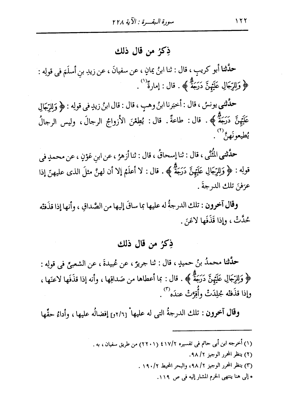 ذِكْرُ مَنْ قَالَ ذَلِكَ حَدَّثَنَا أَبُو كُرَيْبٍ، قَالَ: ثنا ابْنُ يَمَانٍ، عَنْ سُفْيَانَ، عَنْ زَيْدِ بْنِ أَسْلَمَ، فِي قَوْلِهِ: " {§وَلِلرِّجَالِ عَلَيْهِنَّ دَرَجَةٌ} [البقرة: 228] قَالَ: إِمَارَةٌ "