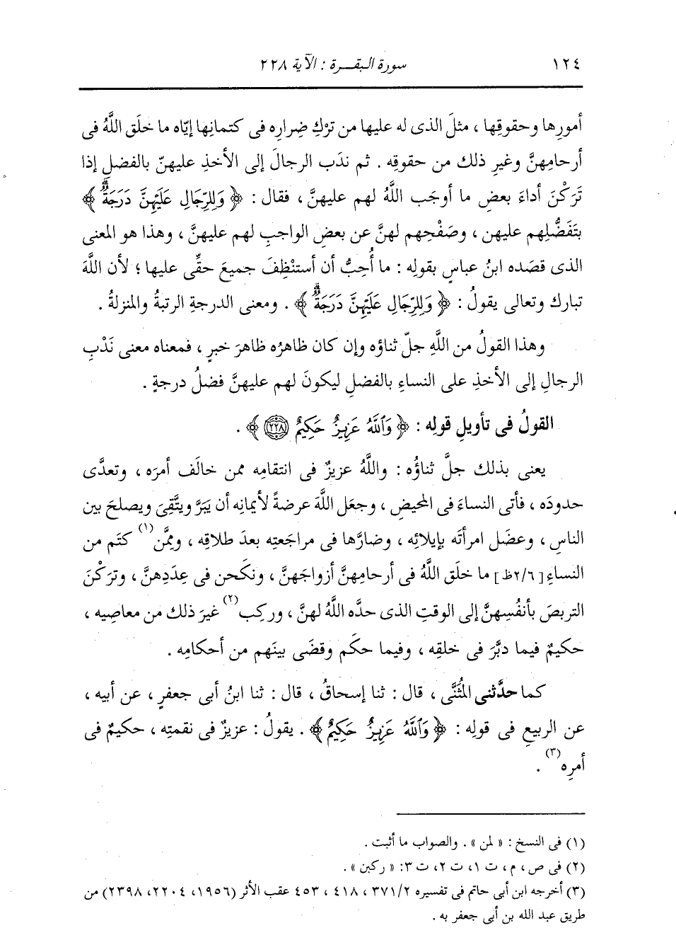 كَمَا حَدَّثَنِي الْمُثَنَّى، قَالَ: ثنا إِسْحَاقُ، قَالَ: ثنا عَبْدُ اللَّهِ بْنُ أَبِي جَعْفَرٍ، عَنْ أَبِيهِ، عَنِ الرَّبِيعِ، فِي قَوْلِهِ: " {§وَاللَّهُ عَزِيزٌ حَكِيمٌ} [البقرة: 228] يَقُولُ: عَزِيزٌ فِي نِقْمَتِهِ، حَكِيمٌ فِي أَمْرِهِ " -[125]- وَإِنَّمَا تَوَعَّدَ اللَّهُ تَعَالَى ذِكْرُهُ بِهَذَا الْقَوْلِ عِبَادَهُ لِتَقْدِيمِهِ قَبْلَ ذَلِكَ بَيَانَ مَا حَرَّمَ عَلَيْهِمْ أَوْ نَهَاهُمْ عَنْهُ مِنَ ابْتِدَاءِ قَوْلِهِ: {وَلَا تَنْكِحُوا الْمُشْرِكَاتِ حَتَّى يُؤْمِنَّ} [البقرة: 221] إِلَى قَوْلِهِ: {وَلِلرِّجَالِ عَلَيْهِنَّ دَرَجَةٌ} [البقرة: 228] ثُمَّ أَتْبَعَ ذَلِكَ بِالْوَعِيدِ لِيَزْدَجِرَ أُولُو النُّهَى، وَلِيَذَكَّرَ أُولُو الْحَجَا، فَيَتَّقُوا عِقَابَهُ، وَيَحْذَرُوا عَذَابَهُ
