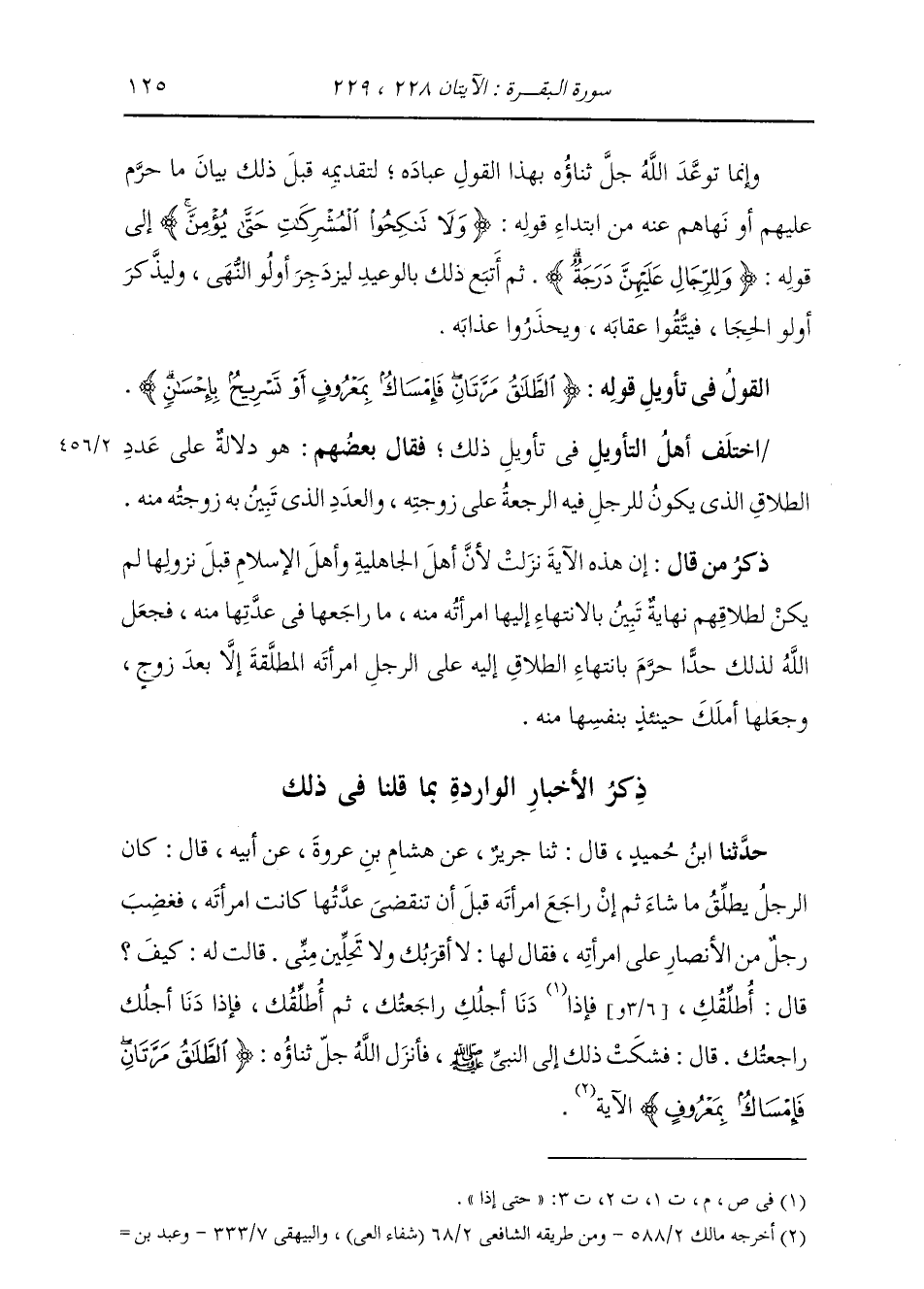 §الْقَوْلُ فِي تَأْوِيلِ قَوْلِهِ تَعَالَى: الطَّلَاقُ مَرَّتَانِ فَإِمْسَاكٌ بِمَعْرُوفٍ أَوْ تَسْرِيحٌ بِإِحْسَانٍ وَلَا يَحِلُّ لَكُمْ أَنْ تَأْخُذُوا مِمَّا آتَيْتُمُوهُنَّ شَيْئًا إِلَّا أَنْ يَخَافَا أَلَّا يُقِيمَا حُدُودَ اللَّهِ فَإِنْ خِفْتُمْ أَلَّا يُقِيمَا حُدُودَ اللَّهِ فَلَا جُنَاحَ عَلَيْهِمَا فِيمَا افْتَدَتْ بِهِ تِلْكَ حُدُودُ اللَّهِ فَلَا تَعْتَدُوهَا وَمَنْ يَتَعَدَّ حُدُودَ اللَّهِ فَأُولَئِكَ هُمُ الظَّالِمُونَ اخْتَلَفَ أَهْلُ التَّأْوِيلِ فِي تَأْوِيلِ ذَلِكَ، فَقَالَ بَعْضُهُمْ: هُوَ دَلَالَةٌ عَلَى عَدَدِ الطَّلَاقِ الَّذِي يَكُونُ لِلرَّجُلِ فِيهِ الرَّجْعَةُ عَلَى زَوْجَتِهِ، وَالْعَدَدُ الَّذِي تَبِينُ بِهِ زَوْجَتُهُ مِنْهُ. ذِكْرُ مَنْ قَالَ إِنَّ هَذِهِ الْآيَةَ أُنْزِلَتْ لِأَنَّ أَهْلَ الْجَاهِلِيَّةِ وَأَهْلَ الْإِسْلَامِ قَبْلَ نُزُولِهَا لَمْ يَكُنْ لِطَلَاقِهِمْ نِهَايَةٌ تَبِينُ بِالِانْتِهَاءِ إِلَيْهَا امْرَأَتُهُ مِنْهُ مَا رَاجَعَهَا فِي عِدَّتِهَا مِنْهُ، فَجَعَلَ اللَّهُ تَعَالَى ذِكْرُهُ لِذَلِكَ حَدًّا حَرَّمَ بِانْتِهَاءِ الطَّلَاقِ إِلَيْهِ عَلَى الرَّجُلِ امْرَأَتَهُ الْمُطَلَّقَةَ إِلَّا بَعْدَ زَوْجٍ، وَجَعَلَهَا حِينَئِذٍ أَمْلَكَ بِنَفْسِهَا مِنْهُ. ذِكْرُ الْأَخْبَارِ الْوَارِدَةِ بِمَا قُلْنَا فِي ذَلِكَ