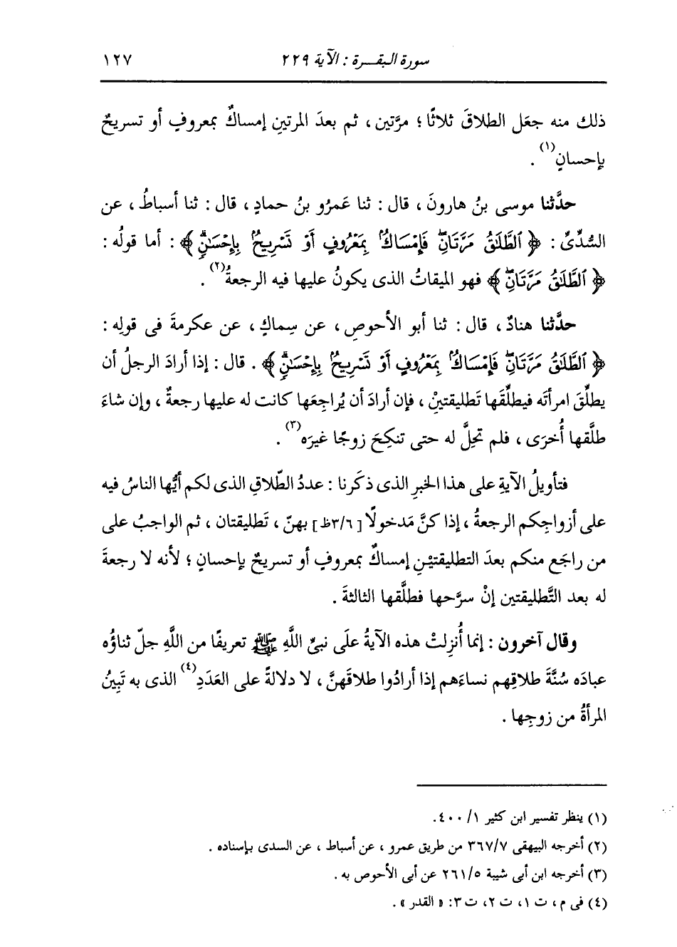 حَدَّثَنِي مُوسَى، قَالَ: ثنا عَمْرٌو، قَالَ: ثنا أَسْبَاطٌ، عَنِ السُّدِّيِّ: " {§الطَّلَاقُ مَرَّتَانِ فَإِمْسَاكٌ بِمَعْرُوفٍ أَوْ تَسْرِيحٌ بِإِحْسَانٍ} [البقرة: 229] أَمَا قَوْلُهُ: {الطَّلَاقُ مَرَّتَانِ} [البقرة: 229] فَهُوَ الْمِيقَاتُ الَّذِي يَكُونُ عَلَيْهَا فِيهِ الرَّجْعَةُ "