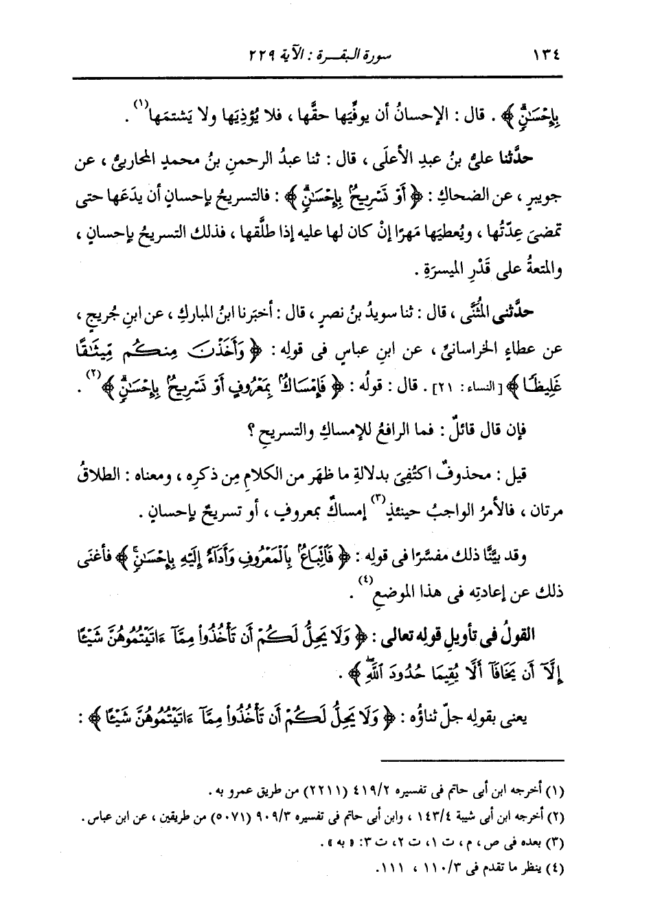 حَدَّثَنِي الْمُثَنَّى، قَالَ: ثنا سُوَيْدُ بْنُ نَصْرٍ، قَالَ: أَخْبَرَنَا ابْنُ الْمُبَارَكِ، عَنِ ابْنِ جُرَيْجٍ، عَنْ عَطَاءٍ الْخُرَاسَانِيِّ، عَنِ ابْنِ عَبَّاسٍ، فِي قَوْلِهِ: " {§وَأَخَذْنَ مِنْكُمْ مِيثَاقًا غَلِيظًا} [النساء: 21] قَالَ قَوْلُهُ: {فَإِمْسَاكٌ بِمَعْرُوفٍ أَوْ تَسْرِيحٌ بِإِحْسَانٍ} [البقرة: 229] " فَإِنْ قَالَ: فَمَا الرَّافِعُ لِلْإِمْسَاكِ وَالتَّسْرِيحِ؟ قِيلَ: مَحْذُوفٌ اكْتُفِيَ بِدَلَالَةِ مَا ظَهَرَ مِنَ الْكَلَامِ مِنْ ذِكْرِهِ، وَمَعْنَاهُ: الطَّلَاقُ مَرَّتَانِ، فَالْأَمْرُ الْوَاجِبُ حِينَئِذٍ بِهِ إِمْسَاكٌ بِمَعْرُوفٍ، أَوْ تَسْرِيحٌ بِإِحْسَانٍ. وَقَدْ بَيَّنَّا ذَلِكَ مُفَسَّرًا فِي قَوْلِهِ: {فَاتِّبَاعٌ بِالْمَعْرُوفِ وَأَدَاءٌ إِلَيْهِ بِإِحْسَانٍ} [البقرة: 178] فَأَغْنَى ذَلِكَ عَنْ إِعَادَتِهِ، فِي هَذَا الْمَوْضِعِ
