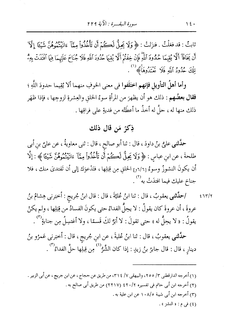 ذِكْرُ مَنْ قَالَ ذَلِكَ حَدَّثَنِي عَلِيُّ بْنُ دَاوُدَ، قَالَ: ثنا أَبُو صَالِحٍ، قَالَ: ثني مُعَاوِيَةُ، عَنْ عَلِيِّ بْنِ أَبِي طَلْحَةَ، عَنِ ابْنِ عَبَّاسٍ: " {§وَلَا يَحِلُّ لَكُمْ أَنْ تَأْخُذُوا مِمَّا آتَيْتُمُوهُنَّ شَيْئًا} [البقرة: 229] إِلَّا أَنْ يَكُونَ النُّشُوزُ، وَسُوءُ الْخُلُقِ مِنْ قِبَلِها، فَتَدْعُوكَ إِلَى أَنْ تَفْتَدِيَ مِنْكَ، فَلَا جُنَاحَ عَلَيْكَ فِيمَا افْتَدَتْ بِهِ "