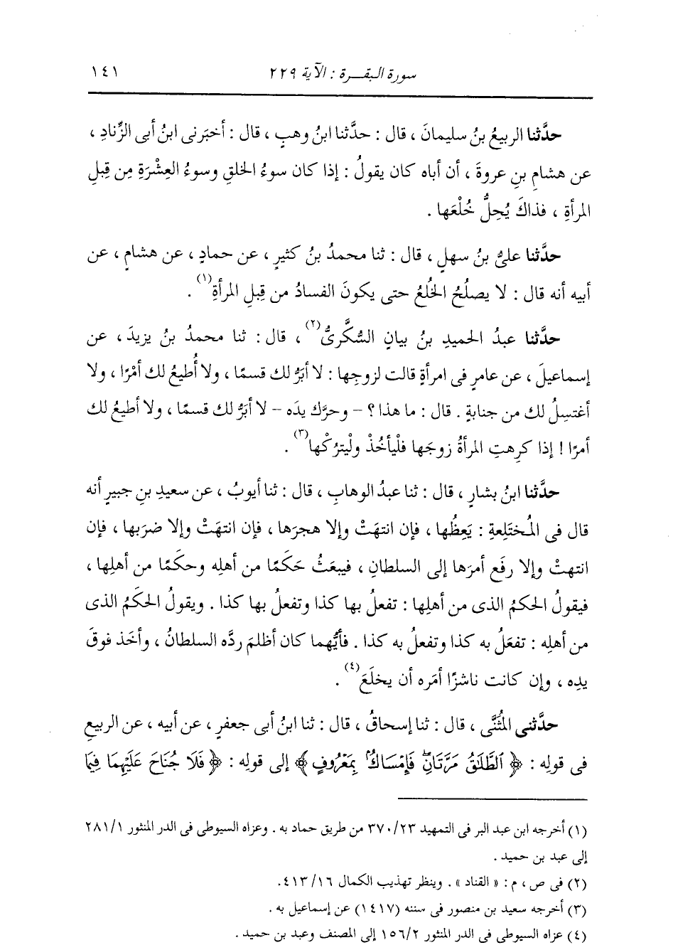 حَدَّثَنِي الْمُثَنَّى، قَالَ: ثنا إِسْحَاقُ، قَالَ: ثنا ابْنُ أَبِي جَعْفَرٍ، عَنْ أَبِيهِ، عَنِ الرَّبِيعِ فِي قَوْلِهِ: " {§الطَّلَاقُ مَرَّتَانِ فَإِمْسَاكٌ بِمَعْرُوفٍ} [البقرة: 229] إِلَى قَوْلِهِ: {فَلَا جُنَاحَ عَلَيْهِمَا فِيمَا -[142]- افْتَدَتْ بِهِ} [البقرة: 229] قَالَ: إِذَا كَانَتِ الْمَرْأَةُ رَاضِيَةً مُغْتَبِطَةً مُطِيعَةً، فَلَا مَحَلَّ لَهُ أَنْ يَضْرِبَهَا، حَتَّى تَفْتَدِيَ مِنْهُ، فَإِنْ أَخَذَ مِنْهَا شَيْئًا عَلَى ذَلِكَ، فَمَا أُخِذَ مِنْهَا فَهُوَ حَرَامٌ، وَإِذَا كَانَ النُّشُوزُ، وَالْبُغْضُ، وَالظُّلْمُ مِنْ قِبَلِهَا، فَقَدْ حَلَّ لَهُ أَنْ يَأْخُذَ مِنْهَا مَا افْتَدَتْ بِهِ "
