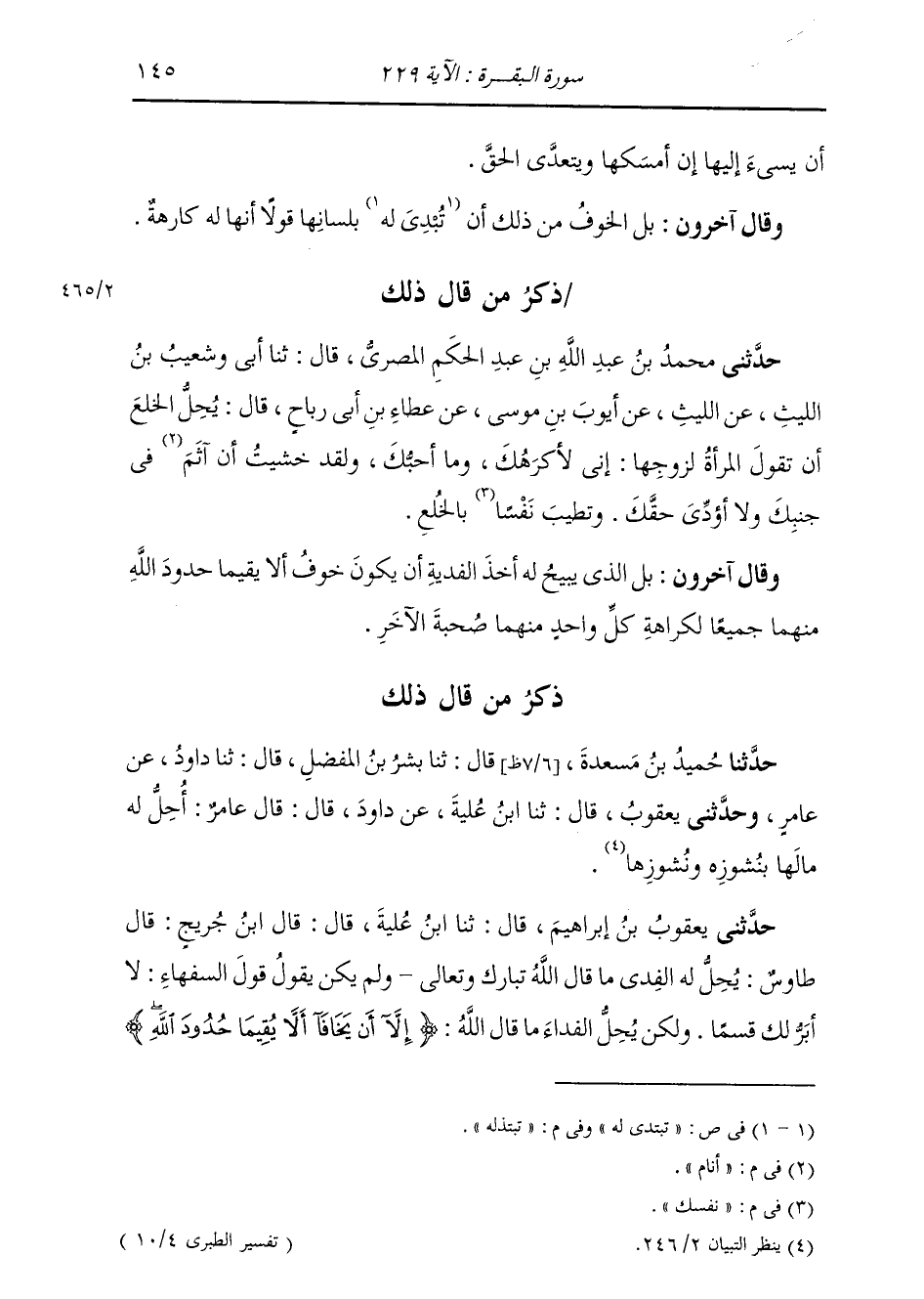 حَدَّثَنِي يَعْقُوبُ بْنُ إِبْرَاهِيمَ، قَالَ: ثنا ابْنُ عُلَيَّةَ، قَالَ: قَالَ ابْنُ جُرَيْجٍ، قَالَ طَاوُسٌ: " يَحِلُّ لَهُ الْفِدَاءُ مَا قَالَ اللَّهُ تَعَالَى ذِكْرُهُ، وَلَمْ يَكُنْ يَقُولُ قَوْلَ السُّفَهَاءِ: لَا أَبَرُّ لَكَ قَسَمًا، وَلَكِنْ يَحِلُّ لَهُ الْفِدَاءُ مَا قَالَ اللَّهُ تَعَالَى ذِكْرُهُ: {§إِلَّا أَنْ يَخَافَا أَلَّا يُقِيمَا حُدُودَ اللَّهِ} [البقرة: 229]-[146]- فِيمَا افْتُرَضَ لِكُلِّ وَاحِدٍ مِنْهُمَا عَلَى صَاحِبِهِ فِي الْعِشْرَةِ، وَالصُّحْبَةِ "