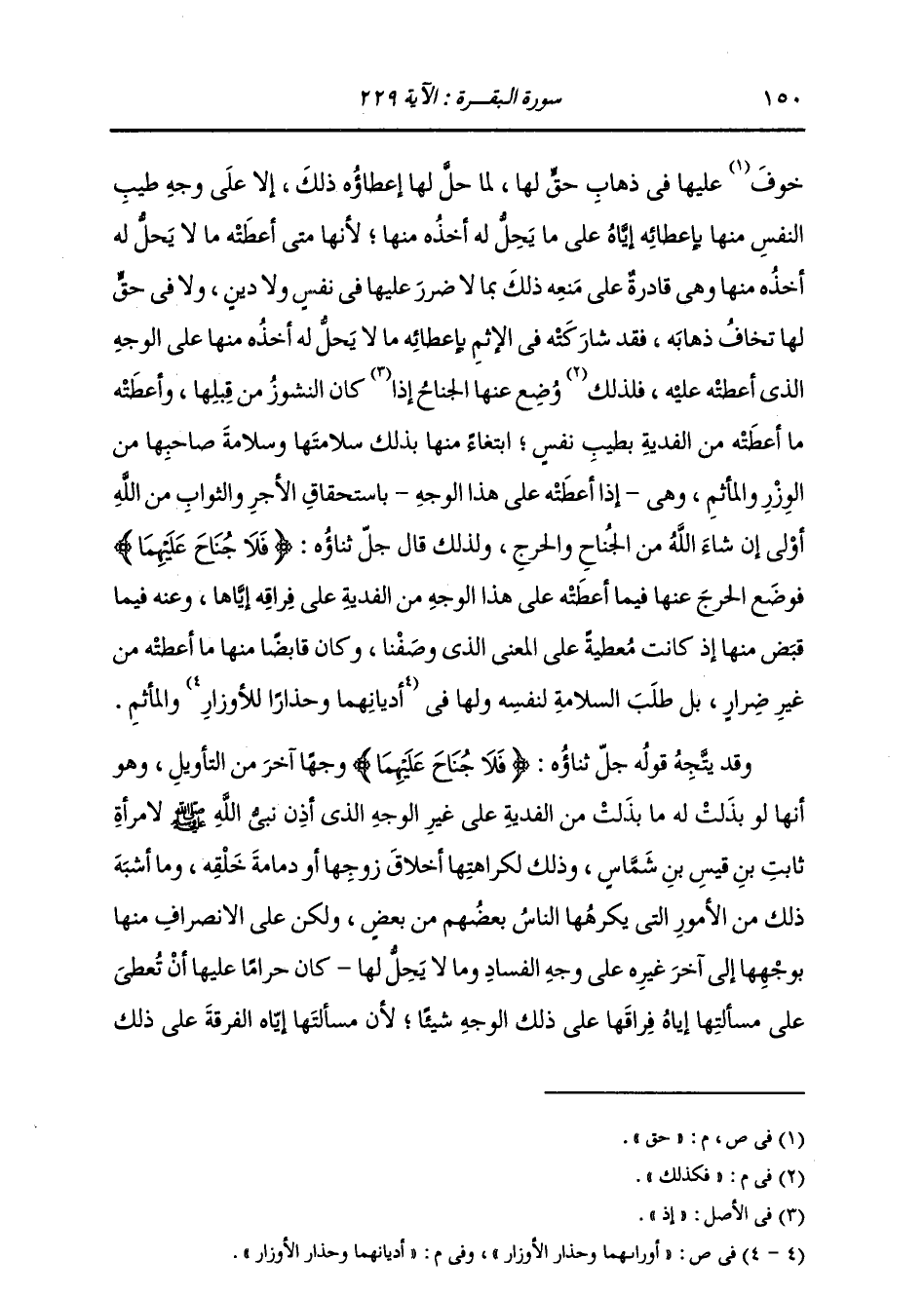 حَقٍّ عَلَيْهَا فِي ذَهَابِ حَقٍّ لَهَا لِمَا حَلَّ لَهَا إِعْطَاؤُهُ ذَلِكَ، إِلَّا عَلَى وَجْهِ طِيبِ النَّفْسِ مِنْهَا بِإِعْطَائِهِ إِيَّاهُ عَلَى مَا يَحِلُّ لَهُ أَخْذُهُ مِنْهَا لِأَنَّهَا مَتَى أَعْطَتْهُ مَا لَا يَحِلُّ لَهُ أَخْذُهُ مِنْهَا وَهِيَ قَادِرَةٌ عَلَى مَنْعِهِ ذَلِكَ بِمَا لَا ضَرَرَ عَلَيْهَا فِي نَفْسٍ، وَلَا دِينٍ، وَلَا فِي حَقٍّ لَهَا تَخَافُ ذَهَابَهُ، فَقَدْ شَارَكَتْهُ فِي الْإِثْمِ بِإِعْطَائِهِ مَا لَا يَحِلُّ لَهُ أَخْذُهُ مِنْهَا عَلَى الْوَجْهِ الَّذِي أَعْطَتْهُ عَلَيْهِ، فَلِذَلِكَ وَضَعَ عَنْهَا الْجُنَاحَ إِذَا كَانَ النُّشُوزُ مِنْ قِبَلِهَا، وَأَعْطَتْهُ مَا أَعْطَتْهُ مِنَ الْفِدْيَةِ بِطِيبِ نَفْسٍ، ابْتِغَاءً مِنْهَا بِذَلِكَ سَلَامَتَهَا، وَسَلَامَةَ صَاحِبِهَا مِنَ الْوِزْرِ، وَالْمَأْثَمِ، وَهِيَ إِذَا أَعْطَتْهُ عَلَى هَذَا الْوَجْهِ بِاسْتِحْقَاقِ الْأَجْرِ وَالثَّوَابِ مِنَ اللَّهِ تَعَالَى أَوْلَى إِنْ شَاءَ اللَّهُ مِنَ الْجُنَاحِ وَالْحَرَجِ، وَلِذَلِكَ قَالَ تَعَالَى ذِكْرُهُ: {فَلَا جُنَاحَ عَلَيْهِمَا} [البقرة: 229] فَوَضَعَ الْحَرَجَ عَنْهَا فِيمَا أَعْطَتْهُ عَلَى هَذَا الْوَجْهِ مِنَ الْفِدْيَةِ عَلَى فِرَاقِهِ إِيَّاهَا، وَعَنْهُ فِيمَا قَبَضَ مِنْهَا إِذَا كَانَتْ مُعْطِيَةً عَلَى الْمَعْنَى الَّذِي وَصَفْنَا، وَكَانَ قَابِضًا مِنْهَا مَا أَعْطَتْهُ مِنْ غَيْرِ ضِرَارٍ، بَلْ طَلَبَ السَّلَامَةَ لِنَفْسِهِ وَلَهَا فِي أَدْيَانِهِمَا، وَحِذَارَ الْأَوْزَارِ، وَالْمَأْثَمِ. وَقَدْ يَتَّجِهُ قَوْلُهُ: {فَلَا جُنَاحَ عَلَيْهِمَا} [البقرة: 229] وَجْهًا آخَرَ مِنَ التَّأْوِيلِ وَهُوَ أَنَّهَا لَوْ بَذَلَتْ مَا بَذَلَتْ مِنَ الْفِدْيَةِ عَلَى غَيْرِ الْوَجْهِ الَّذِي أَذِنَ نَبِيُّ اللَّهِ صَلَّى اللهُ عَلَيْهِ وَسَلَّمَ لِامْرَأَةِ ثَابِتِ بْنِ قَيْسِ بْنِ شَمَّاسٍ، وَذَلِكَ لِكَرَاهَتِهَا أَخْلَاقَ زَوْجِهَا أَوْ دَمَامَةَ خَلْقِهِ، وَمَا أَشْبَهَ ذَلِكَ مِنَ الْأُمُورِ الَّتِي يَكْرَهُهَا النَّاسُ بَعْضُهُمْ مِنْ بَعْضٍ، وَلَكِنْ عَلَى الِانْصِرَافِ مِنْهَا بِوَجْهِهَا إِلَى آخَرَ غَيْرِهِ عَلَى وَجْهِ الْفَسَادِ وَمَا لَا يَحِلُّ لَهَا كَانَ حَرَامًا عَلَيْهَا أَنَّ تُعْطِيَ عَلَى مَسْأَلَتِهَا إِيَّاهُ فِرَاقَهَا عَلَى ذَلِكَ الْوَجْهِ شَيْئًا؛ لِأَنَّ مَسْأَلَتَهَا إِيَّاهُ الْفُرْقَةَ عَلَى ذَلِكَ