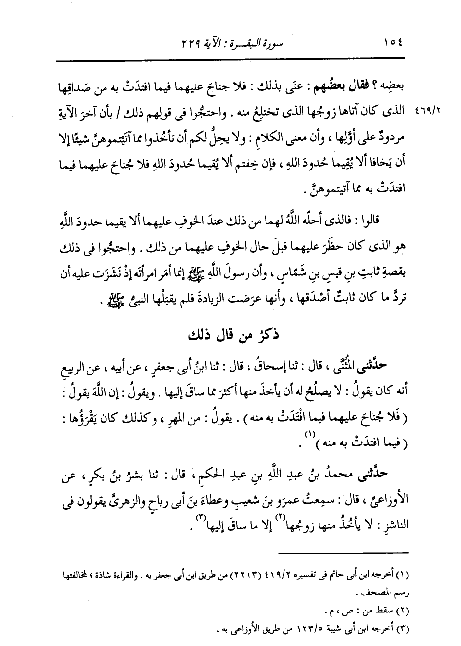 ذِكْرُ مَنْ قَالَ ذَلِكَ حَدَّثَنِي الْمُثَنَّى، قَالَ: ثنا إِسْحَاقُ، قَالَ: ثنا ابْنُ أَبِي جَعْفَرٍ، عَنْ أَبِيهِ، عَنِ الرَّبِيعِ، أَنَّهُ كَانَ يَقُولُ: " لَا يَصْلُحُ لَهُ أَنْ يَأْخُذَ مِنْهَا أَكْثَرَ مِمَّا سَاقَ إِلَيْهَا، وَيَقُولُ: إِنَّ اللَّهَ يَقُولُ: {§فَلَا جُنَاحَ عَلَيْهِمَا فِيمَا افْتَدَتْ بِهِ} [البقرة: 229] مِنْهُ، يَقُولُ: مِنَ الْمَهْرِ. وَكَذَلِكَ كَانَ يَقْرَؤُهَا: «فِيمَا افْتَدَتْ بِهِ مِنْهُ»