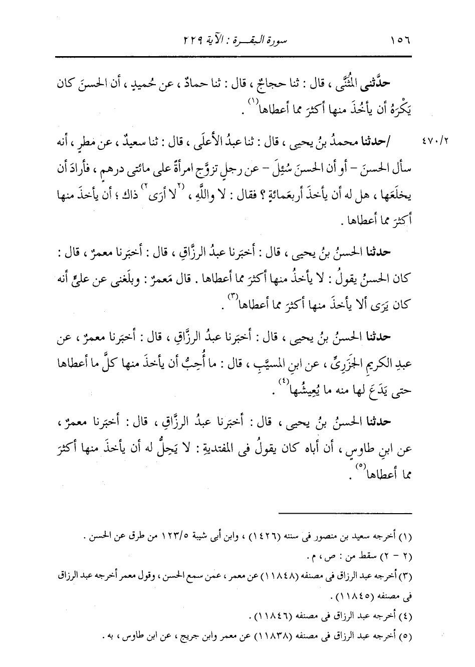حَدَّثَنِي الْمُثَنَّى، قَالَ: ثنا حَجَّاجٌ، قَالَ: ثنا حَمَّادٌ، عَنْ حُمَيْدٍ، أَنَّ الْحَسَنَ «كَانَ §يَكْرَهُ أَنْ يَأْخُذَ مِنْهَا أَكْثَرَ مِمَّا أَعْطَاهَا»