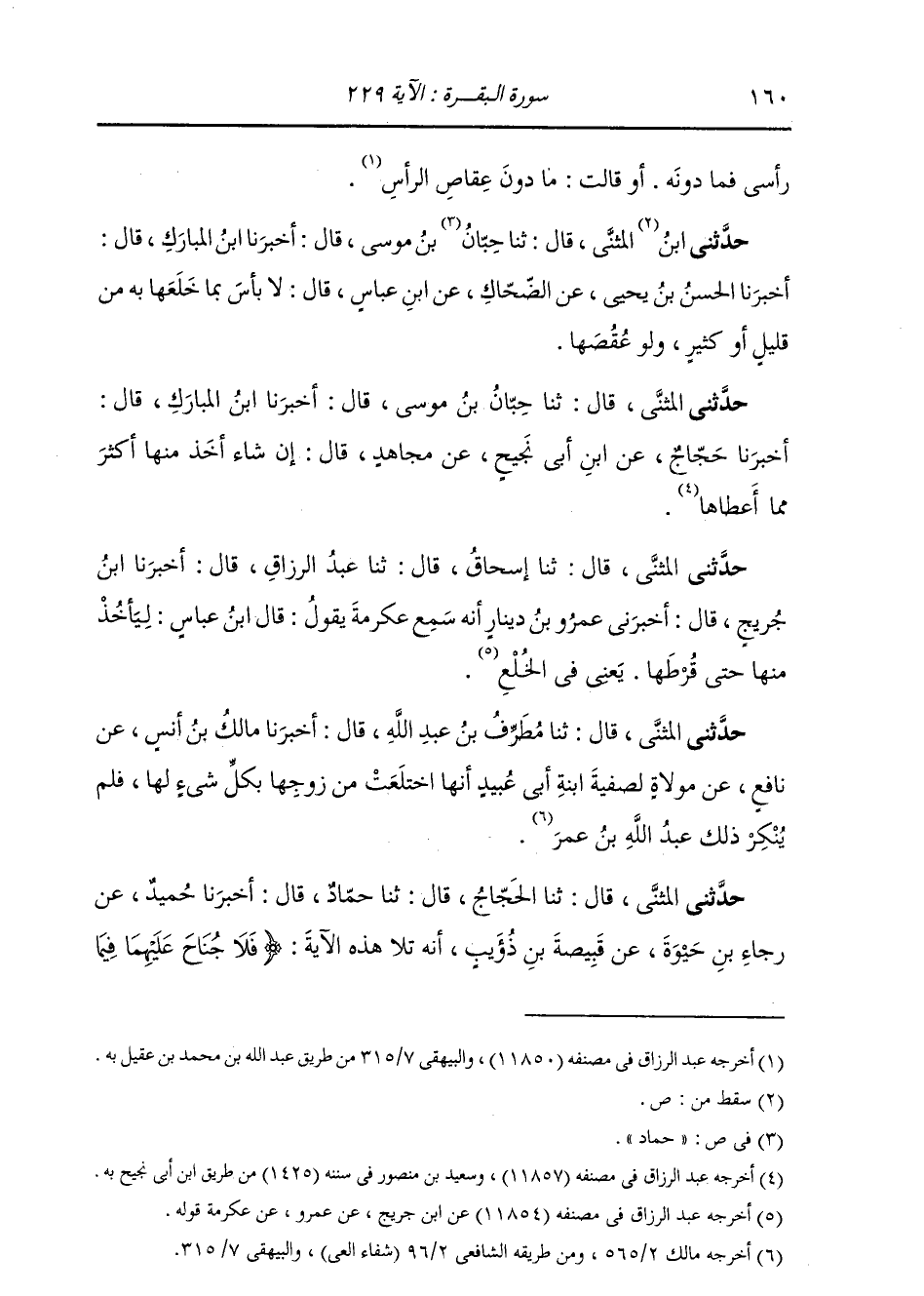 حَدَّثَنِي الْمُثَنَّى، قَالَ: ثنا الْحَجَّاجُ، قَالَ: ثنا حَمَّادٌ، قَالَ: أَخْبَرَنَا حُمَيْدٌ، عَنْ رَجَاءِ بْنِ حَيْوَةَ، عَنْ قَبِيصَةَ بْنِ ذُؤَيْبٍ " أَنَّهُ تَلَا هَذِهِ الْآيَةَ: {§فَلَا جُنَاحَ عَلَيْهِمَا فِيمَا -[161]- افْتَدَتْ بِهِ} [البقرة: 229] قَالَ: يَأْخُذُ أَكْثَرَ مِمَّا أَعْطَاهَا "