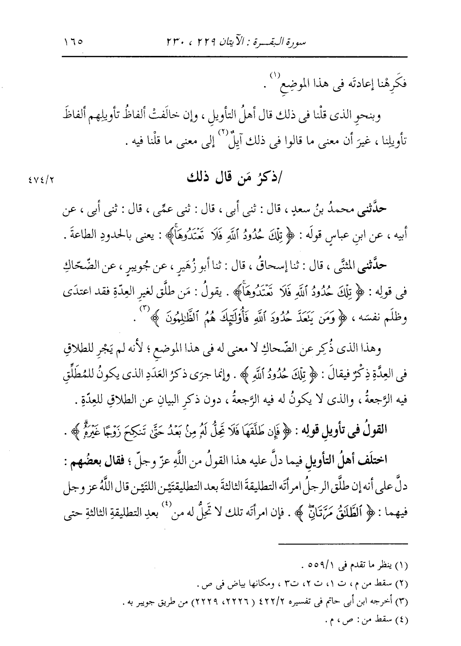 حَدَّثَنِي الْمُثَنَّى، قَالَ: ثنا إِسْحَاقُ، قَالَ: ثنا أَبُو زُهَيْرٍ، عَنْ جُوَيْبِرٍ، عَنِ الضَّحَّاكِ، فِي قَوْلِهِ: " {§تِلْكَ حُدُودُ اللَّهِ فَلَا تَعْتَدُوهَا} [البقرة: 229] يَقُولُ: مَنْ طَلَّقَ لِغَيْرِ الْعِدَّةِ فَقَدِ اعْتَدَى وَظَلَمَ نَفْسَهُ، وَمَنْ يَتَعَدَّ حُدُودَ اللَّهِ، فَأُولَئِكَ هُمُ الظَّالِمُونَ " قَالَ أَبُو جَعْفَرٍ: وَهَذَا الَّذِي ذُكِرَ عَنِ الضَّحَّاكِ لَا مَعْنَى لَهُ فِي هَذَا الْمَوْضِعِ، لِأَنَّهُ لَمْ يَجْرِ لِلطَّلَاقِ فِي الْعِدَّةِ ذِكْرٌ، فَيُقَالُ: تِلْكَ حُدُودُ اللَّهِ، وَإِنَّمَا جَرَى ذِكْرُ الْعَدَدِ الَّذِي يَكُونُ لِلْمُطَلِّقِ فِيهِ الرَّجْعَةُ، وَالَّذِي لَا يَكُونُ لَهُ فِيهِ الرَّجْعَةُ دُونَ ذِكْرِ الْبَيَانِ عَنِ الطَّلَاقِ لِلْعِدَّةِ