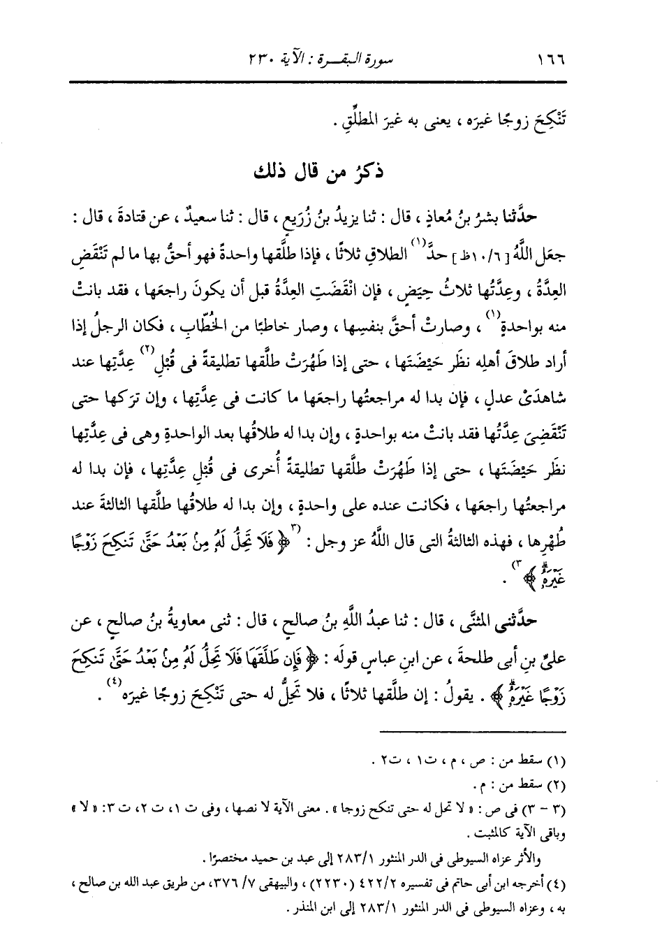 حَدَّثَنِي الْمُثَنَّى، قَالَ: ثنا عَبْدُ اللَّهِ بْنُ صَالِحٍ قَالَ: ثني مُعَاوِيَةُ بْنُ صَالِحٍ، عَنْ عَلِيِّ بْنِ أَبِي طَلْحَةَ، عَنِ ابْنِ عَبَّاسٍ قَوْلَهُ: " {§فَإِنْ طَلَّقَهَا فَلَا تَحِلُّ لَهُ مِنْ بَعْدُ حَتَّى تَنْكِحَ زَوْجًا غَيْرَهُ} [البقرة: 230] يَقُولُ: إِنْ طَلَّقَهَا ثَلَاثًا، فَلَا تَحِلُّ حَتَّى تَنْكِحَ زَوْجًا غَيْرَهُ "