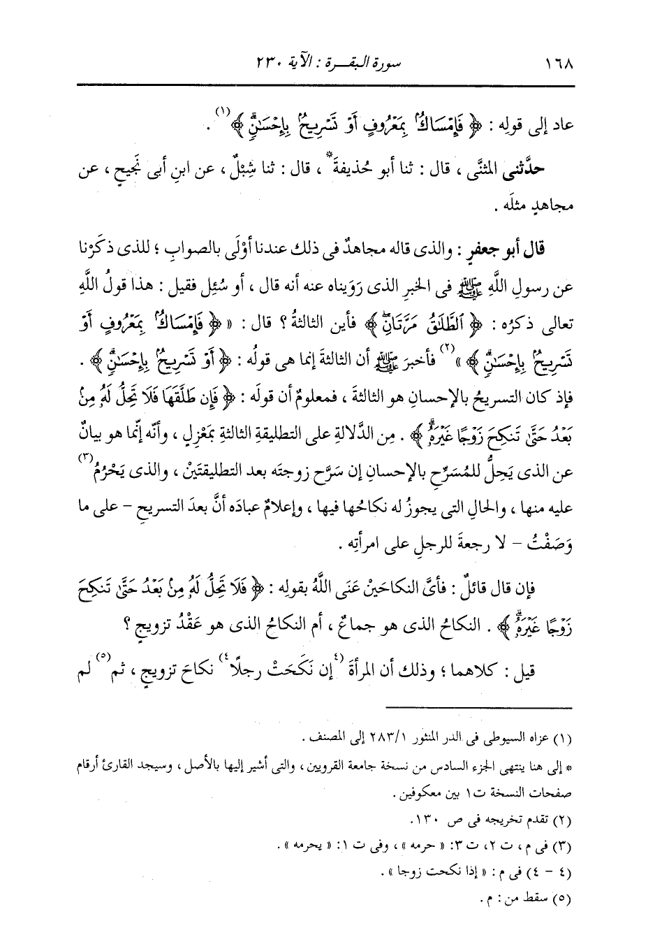 عَادَ إِلَى قَوْلِهِ: {فَإِمْسَاكٌ بِمَعْرُوفٍ أَوْ تَسْرِيحٌ بِإِحْسَانٍ} [البقرة: 229] " حَدَّثَنِي الْمُثَنَّى، قَالَ: ثنا أَبُو حُذَيْفَةَ، قَالَ: ثنا شِبْلٌ، عَنِ ابْنِ أَبِي نَجِيحٍ، عَنْ مُجَاهِدٍ، مِثْلَهُ قَالَ أَبُو جَعْفَرٍ: وَالَّذِي قَالَهُ مُجَاهِدٌ فِي ذَلِكَ عِنْدَنَا أَوْلَى بِالصَّوَابِ لِلَّذِي ذَكَرْنَا عَنْ رَسُولِ اللَّهِ صَلَّى اللهُ عَلَيْهِ وَسَلَّمَ فِي الْخَبَرِ الَّذِي رُوِّينَاهُ عَنْهُ أَنَّهُ قَالَ: أَوْ سُئِلَ فَقِيلَ: هَذَا قَوْلُ اللَّهِ تَعَالَى ذِكْرُهُ: {الطَّلَاقُ مَرَّتَانِ} [البقرة: 229] فَأَيْنَ الثَّالِثَةُ؟ قَالَ: «فَإِمْسَاكٌ بِمَعْرُوفٍ أَوْ تَسْرِيحٌ بِإِحْسَانٍ» . فَأُخْبِرَ صَلَّى اللهُ عَلَيْهِ وَسَلَّمَ، أَنَّ الثَّالِثَةَ إِنَّمَا هِيَ قَوْلُهُ: {أَوْ تَسْرِيحٌ بِإِحْسَانٍ} [البقرة: 229] فَإِذْا كَانَ التَّسْرِيحُ بِالْإِحْسَانِ هُوَ الثَّالِثَةُ، فَمَعْلُومٌ أَنَّ قَوْلَهُ: {فَإِنْ طَلَّقَهَا فَلَا تَحِلُّ لَهُ مِنْ بَعْدُ حَتَّى تُنْكَحَ زَوْجًا غَيْرَهُ} [البقرة: 230] مِنَ الدَّلَالَةِ عَلَى التَّطْلِيقَةِ الثَّالِثَةِ بِمَعْزَلٍ، وَأَنَّهُ إِنَّمَا هُوَ بَيَانٌ عَنِ الَّذِي يَحِلُّ لِلْمُسَرِّحِ بِالْإِحْسَانِ إِنْ سَرَّحَ زَوْجَتَهُ بَعْدَ التَّطْلِيقَتَيْنِ، وَالَّذِي يَحْرُمُ عَلَيْهِ مِنْهَا، وَالْحَالُ الَّتِي يَجُوزُ لَهُ نِكَاحُهَا فِيهَا، وَإِعْلَامُ عِبَادِهِ أَنَّ بَعْدَ التَّسْرِيحِ عَلَى مَا وَصَفْتُ لَا رَجْعَةَ لِلرَّجُلِ عَلَى امْرَأَتِهِ. فَإِنْ قَالَ قَائِلٌ: فَأَيُّ النِّكَاحَيْنِ عَنَى اللَّهُ بِقَوْلِهِ: {فَلَا تَحِلُّ لَهُ مِنْ بَعْدُ حَتَّى تَنْكِحَ زَوْجًا غَيْرَهُ} [البقرة: 230] النِّكَاحُ الَّذِي هُوَ جِمَاعٌ أَمِ النِّكَاحُ الَّذِي هُوَ عَقْدُ تَزْوِيجٍ؟ قِيلَ: كِلَاهُمَا، وَذَلِكَ أَنَّ الْمَرْأَةَ إِذَا نَكَحَتْ رَجُلًا نِكَاحَ تَزْوِيجٍ لَمْ