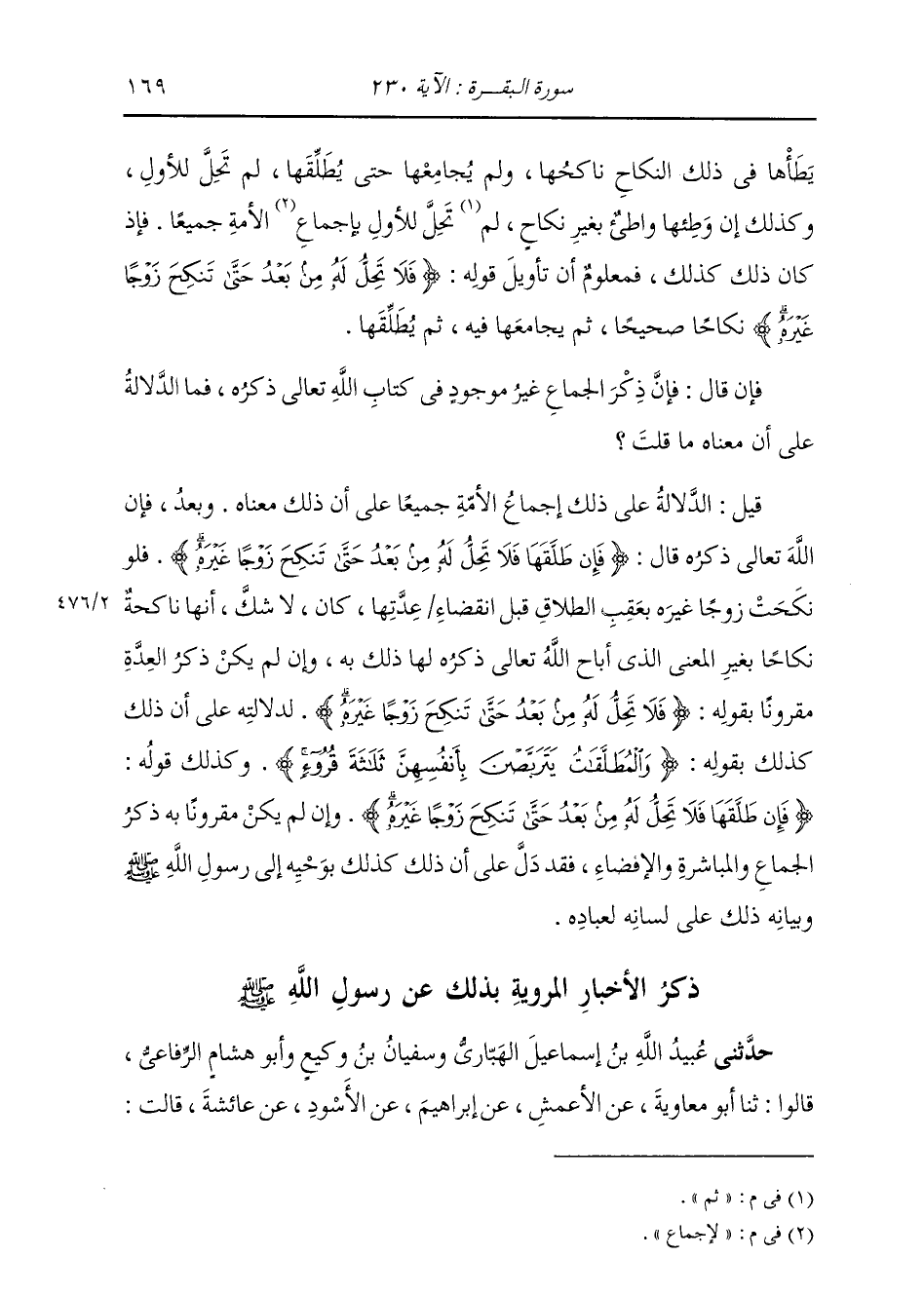 يَطَأْهَا فِي ذَلِكَ النِّكَاحِ نَاكِحُهَا وَلَمْ يُجَامِعْهَا حَتَّى يُطَلِّقَهَا لَمْ تَحِلَّ لِلْأَوَّلِ، وَكَذَلِكَ إِنْ وَطِئَهَا وَاطِئٌ بِغَيْرِ نِكَاحٍ لَمْ تَحِلَّ لِلْأَوَّلِ بِإِجْمَاعِ الْأُمَّةِ جَمِيعًا. فَإِذْ كَانَ ذَلِكَ كَذَلِكَ، فَمَعْلُومٌ أَنْ تَأْوِيلَ قَوْلِهِ: {فَلَا تَحِلُّ لَهُ مِنْ بَعْدُ حَتَّى تَنْكِحَ زَوْجًا غَيْرَهُ} [البقرة: 230] نِكَاحًا صَحِيحًا، ثُمَّ يُجَامِعُهَا فِيهِ، ثُمَّ يُطَلِّقُهَا. فَإِنْ قَالَ: فَإِنَّ ذِكْرَ الْجِمَاعِ غَيْرُ مَوْجُودٍ فِي كِتَابِ اللَّهِ تَعَالَى ذِكْرُهُ، فَمَا الدَّلَالَةُ عَلَى أَنَّ مَعْنَاهُ مَا قُلْتَ؟ قِيلَ: الدَّلَالَةُ عَلَى ذَلِكَ إِجْمَاعُ الْأُمَّةِ جَمِيعًا عَلَى أَنَّ ذَلِكَ مَعْنَاهُ. وَبَعْدُ، فَإِنَّ اللَّهَ تَعَالَى ذِكْرُهُ قَالَ: {فَإِنْ طَلَّقَهَا فَلَا تَحِلُّ لَهُ مِنْ بَعْدُ حَتَّى تَنْكِحَ زَوْجًا غَيْرَهُ} [البقرة: 230] فَلَوْ نَكَحَتْ زَوْجًا غَيْرَهُ بِعَقِبِ الطَّلَاقِ قَبْلَ انْقِضَاءِ عِدَّتِهَا، كَانَ لَا شَكَّ أَنَّهَا نَاكِحَةٌ نِكَاحًا بِغَيْرِ الْمَعْنَى الَّذِي أَبَاحَ اللَّهُ تَعَالَى ذِكْرُهُ لَهَا ذَلِكَ بِهِ، وَإِنْ لَمْ يَكُنْ ذِكْرُ الْعِدَّةِ مَقْرُونًا بِقَوْلِهِ: {فَلَا تَحِلُّ لَهُ مِنْ بَعْدُ حَتَّى تَنْكِحَ زَوْجًا غَيْرَهُ} [البقرة: 230] لِدَلَالَتِهِ عَلَى أَنَّ ذَلِكَ كَذَلِكَ بِقَوْلِهِ: {وَالْمُطَلَّقَاتُ يَتَرَبَّصْنَ بِأَنْفُسِهِنَّ ثَلَاثَةَ قُرُوءٍ} [البقرة: 228] وَكَذَلِكَ قَوْلُهُ: {فَإِنْ طَلَّقَهَا فَلَا تَحِلُّ لَهُ مِنْ بَعْدُ حَتَّى تَنْكِحَ زَوْجًا غَيْرَهُ} [البقرة: 230] وَإِنْ لَمْ يَكُنْ مَقْرُونًا بِهِ ذِكْرُ الْجِمَاعِ، وَالْمُبَاشَرَةِ، وَالْإِفْضَاءِ فَقَدْ دَلَّ عَلَى أَنَّ ذَلِكَ كَذَلِكَ بِوَحْيِهِ إِلَى رَسُولِ اللَّهِ صَلَّى اللهُ عَلَيْهِ وَسَلَّمَ وَبَيَانِهِ ذَلِكَ عَلَى لِسَانِهِ لِعِبَادِهِ. ذِكْرُ الْأَخْبَارِ الْمَرْوِيَّةِ بِذَلِكَ عَنْ رَسُولِ اللَّهِ صَلَّى اللهُ عَلَيْهِ وَسَلَّمَ