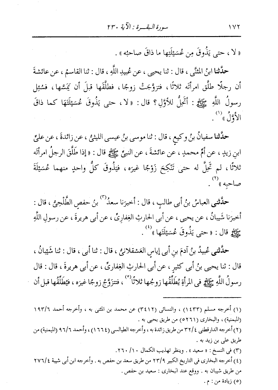حَدَّثَنَا سُفْيَانُ بْنُ وَكِيعٍ، قَالَ: ثنا مُوسَى بْنُ عِيسَى اللَّيْثِيُّ، عَنْ زَائِدَةَ، عَنْ عَلِيِّ بْنِ زَيْدٍ، عَنْ أُمِّ مُحَمَّدٍ، عَنْ عَائِشَةَ، عَنِ النَّبِيِّ صَلَّى اللهُ عَلَيْهِ وَسَلَّمَ، قَالَ: «إِذَا طَلَّقَ الرَّجُلُ امْرَأَتَهُ ثَلَاثًا §لَمْ تَحِلَّ لَهُ حَتَّى تَنْكِحَ زَوْجًا غَيْرَهُ، فَيَذُوقَ كُلُّ وَاحِدٍ مِنْهُمَا عُسَيْلَةَ صَاحِبِهِ»