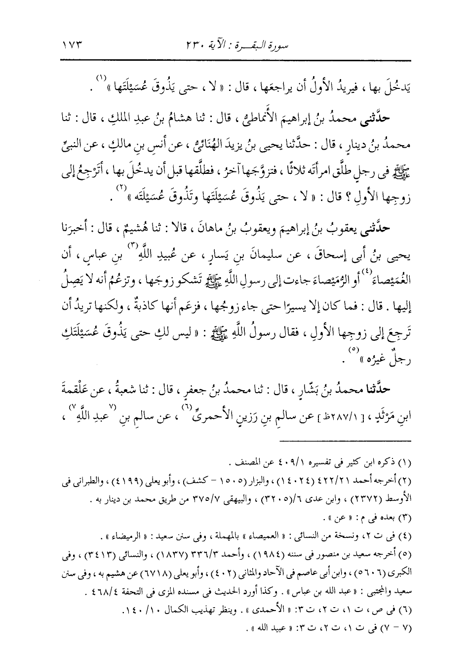 حَدَّثَنِي يَعْقُوبُ بْنُ إِبْرَاهِيمَ، وَيَعْقُوبُ بْنُ مَاهَانَ، قَالَا: ثنا هُشَيْمٌ، قَالَ: أَخْبَرَنَا يَحْيَى بْنُ أَبِي إِسْحَاقَ، عَنْ سُلَيْمَانَ بْنِ يَسَارٍ، عَنْ عُبَيْدِ اللَّهِ بْنِ الْعَبَّاسِ: أَنَّ الْغُمَيْصَاءَ أَوِ الرُّمَيْصَاءَ جَاءَتْ إِلَى رَسُولِ اللَّهِ صَلَّى اللهُ عَلَيْهِ وَسَلَّمَ تَشْكُو زَوْجَهَا، وَتَزْعُمُ أَنَّهُ لَا يِصِلُ إِلَيْهَا، قَالَ: فَمَا كَانَ إِلَّا يَسِيرًا حَتَّى جَاءَ زَوْجُهَا، فَزَعَمَ أَنَّهَا كَاذِبَةٌ، وَلَكِنَّهَا تُرِيدُ أَنْ تَرْجِعَ إِلَى زَوْجِهَا الْأَوَّلِ، فَقَالَ رَسُولُ اللَّهِ صَلَّى اللهُ عَلَيْهِ وَسَلَّمَ: «§لَيْسَ لَكِ حَتَّى يَذُوقَ عُسَيْلَتَكِ رَجُلٌ غَيْرُهُ»