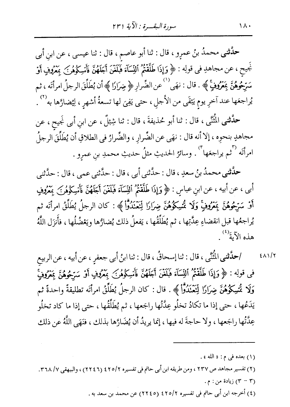 حَدَّثَنِي مُحَمَّدُ بْنُ عَمْرٍو، قَالَ: ثنا أَبُو عَاصِمٍ، قَالَ: ثنا عِيسَى، عَنِ ابْنِ أَبِي نَجِيحٍ، عَنْ مُجَاهِدٍ، فِي قَوْلِهِ: " {§وَإِذَا طَلَّقْتُمُ النِّسَاءَ فَبَلَغْنَ أَجَلَهُنَّ فَأَمْسِكُوهُنَّ بِمَعْرُوفٍ أَوْ سَرِّحُوهُنَّ بِمَعْرُوفٍ} [البقرة: 231] قَالَ نَهَى اللَّهُ عَنِ الضِّرَارِ ضِرَارًا أَنْ يُطَلِّقَ الرَّجُلُ امْرَأَتَهُ، ثُمَّ يُرَاجِعُهَا عِنْدَ آخَرَ يَوْمِ يَبْقَى مِنَ الْأَجَلِ حَتَّى يَفِيَ لَهَا تِسْعَةُ أَشْهُرٍ لِيُضَارَّهَا بِهِ " حَدَّثَنِي الْمُثَنَّى، قَالَ: ثنا أَبُو حُذَيْفَةَ، قَالَ: ثنا شِبْلٌ، عَنِ ابْنِ أَبِي نَجِيحٍ، عَنْ مُجَاهِدٍ، بِنَحْوِهِ، إِلَّا أَنَّهُ قَالَ: نَهَى عَنِ الضِّرَارِ، وَالضِّرَارُ، فِي الطَّلَاقِ: أَنْ يُطَلِّقَ، الرَّجُلُ امْرَأَتَهُ ثُمَّ يُرَاجِعُهَا. وَسَائِرُ الْحَدِيثِ مِثْلُ حَدِيثِ مُحَمَّدِ بْنِ عَمْرٍو