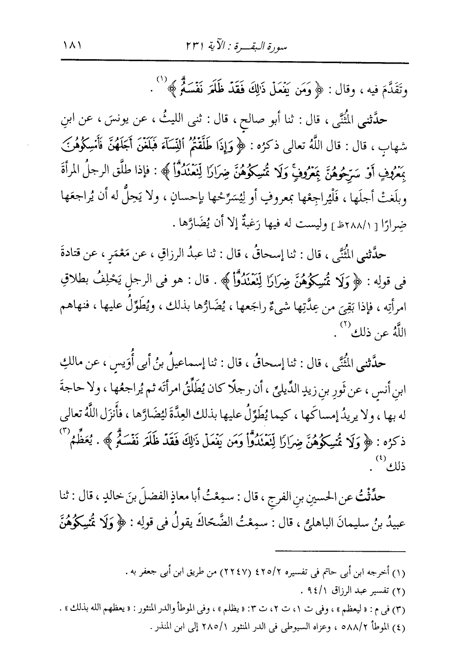حَدَّثَنِي الْمُثَنَّى، قَالَ: ثنا أَبُو صَالِحٍ، قَالَ: ثني اللَّيْثُ، عَنْ يُونُسَ، عَنِ ابْنِ شِهَابٍ، قَالَ: قَالَ اللَّهُ تَعَالَى ذِكْرُهُ: " {§وَإِذَا طَلَّقْتُمُ النِّسَاءَ فَبَلَغْنَ أَجَلَهُنَّ فَأَمْسِكُوهُنَّ بِمَعْرُوفٍ أَوْ سَرِّحُوهُنَّ بِمَعْرُوفٍ وَلَا تُمْسِكُوهُنَّ ضِرَارًا لِتَعْتَدُوا} [البقرة: 231] فَإِذَا طَلَّقَ الرَّجُلُ الْمَرْأَةَ، وَبَلَغَتْ أَجَلَهَا فَلْيُرَاجِعْهَا بِمَعْرُوفٍ أَوْ لِيُسَرِّحْهَا بِإِحْسَانٍ، وَلَا يَحِلُّ لَهُ أَنْ يُرَاجِعَهَا ضِرَارًا، وَلَيْسَتْ لَهُ فِيهَا رَغْبَةٌ إِلَّا أَنَّ يُضَارَّهَا "